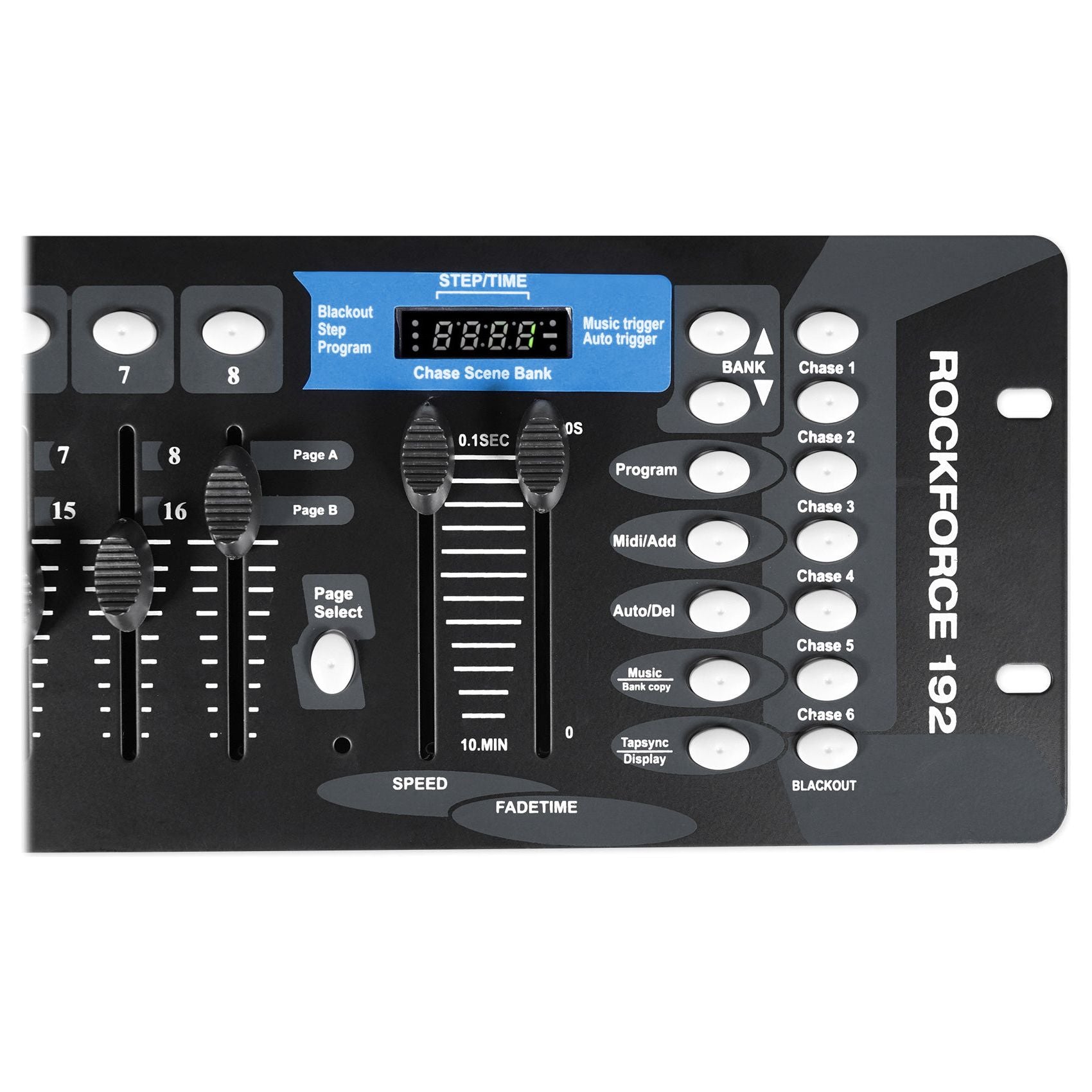 With the Rockforce 192 you can control 12 lights with up to 16 channels per light. In addition there is a 4 bit LED display and built in microphone which can be used to set up automatic modes. A great function we would like to mention is that you can take the program from any light and easily assign it to another light. This added feature provides flexibility and will saves you a ton of time at your next gig!