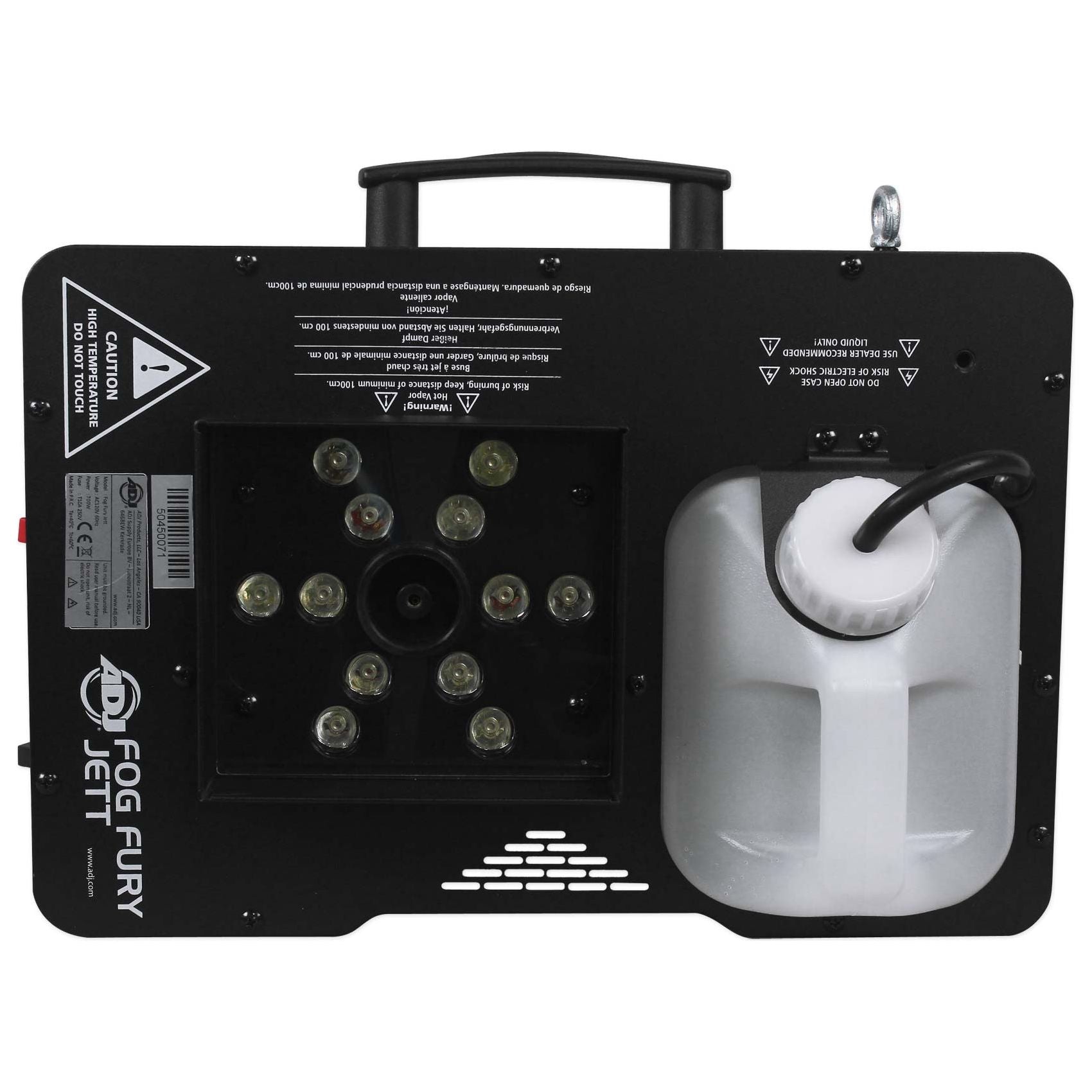 The ADJ Fog Fury Jett is a high velocity vertical Fog Machine that mixes color into the fog from 12x 3-Watt RGBA LEDs. With new advances in ADJ’s heater technology, the Fog Fury Jett produces a dry even blast of fog over 25 feet (7 meters) in the air. It has a special heating element design that uses an oil type transmission throughout the pipeline to prevent clogging. It is also equipped with a high performance Italian pump system for optimum output. ADJ’s Electronic Thermo Sensing (ETS) technology is on-board to maintain optimum heat levels with short warm-up time between fog blasts.