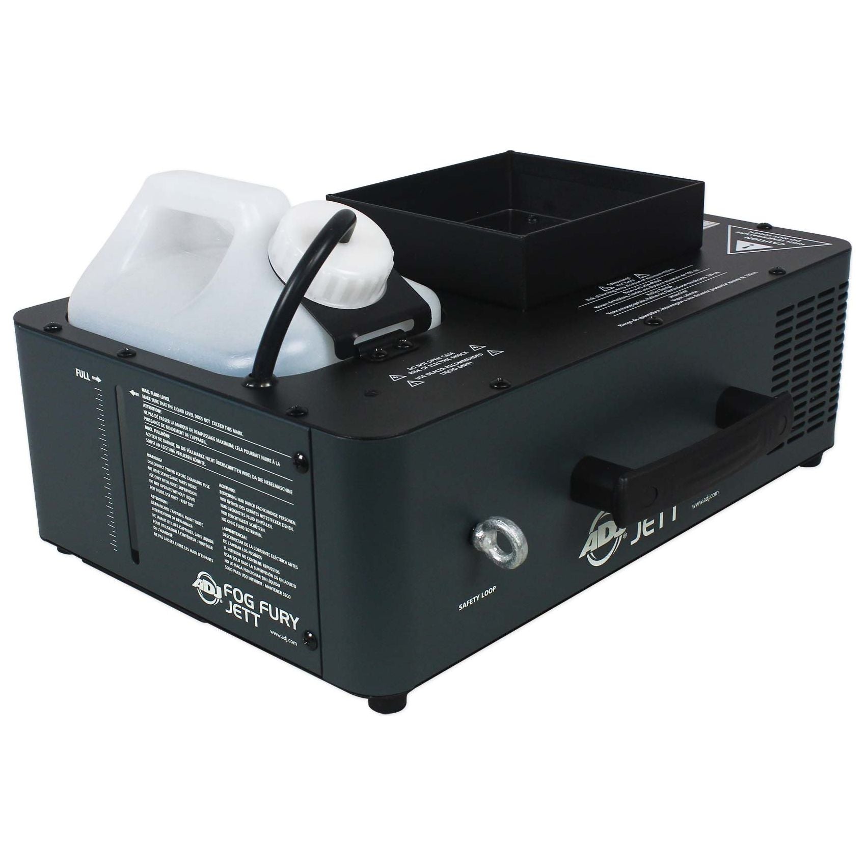 The Fog Fury Jett may be use vertically or horizontally. The reservoir tank may be mounted in the front or rear of the unit so the machine may be pointed up or down. The ADJ FFJWR wireless remote comes included with the Fog Fury Jett.