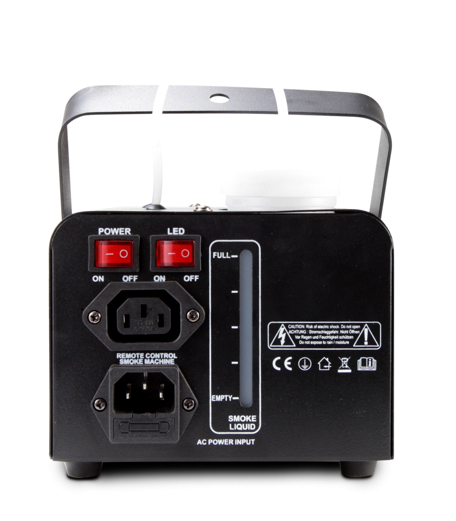 The LEDs flame effect can be switched On/Off on the back of the machine. Fog production can be activated on the supplied remote control or the On/Off switch on the rear. The Amber Fog 700 LED comes with a hanging bracket so it can be hung on truss, and it has rubber feet built-in so it may be operated from the ground.