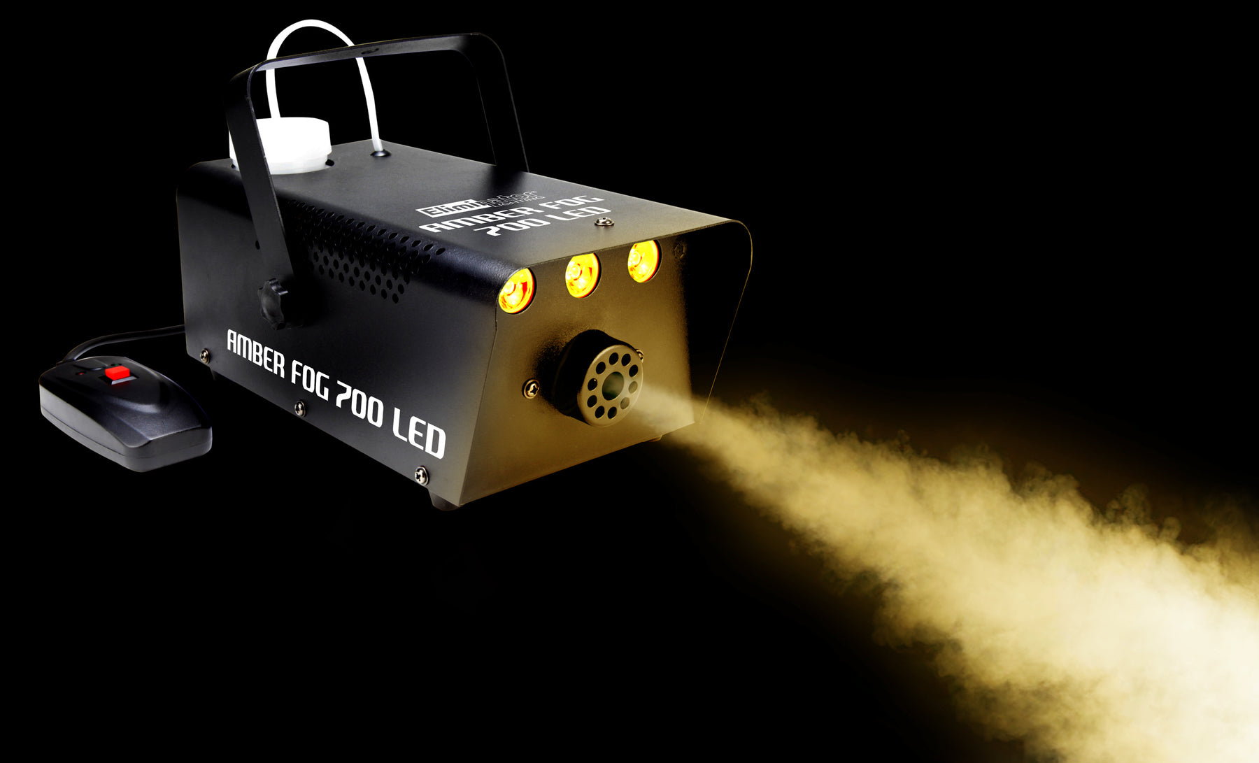 The Eliminator Lighting Amber Fog 700 LED is a unique fog machine that not only produces a rapid, thick cloud of smoke, but it also has three 1W amber LEDs built in to color the fog, similar to a flame effect as it comes out of the machine. Uses standard water-based fog fluid. Includes remote control. Its compact, lightweight and easy-to-use.