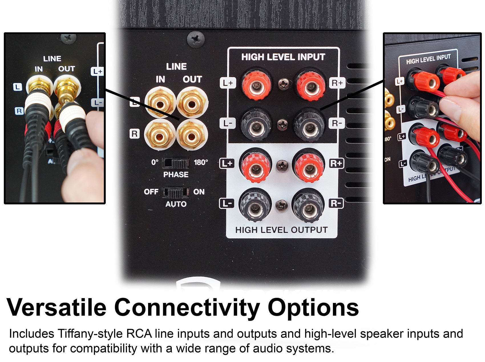 Our subwoofer has top quality Tiffany-style RCA inputs and outputs as well as high level speaker inputs and outputs to support any setup.