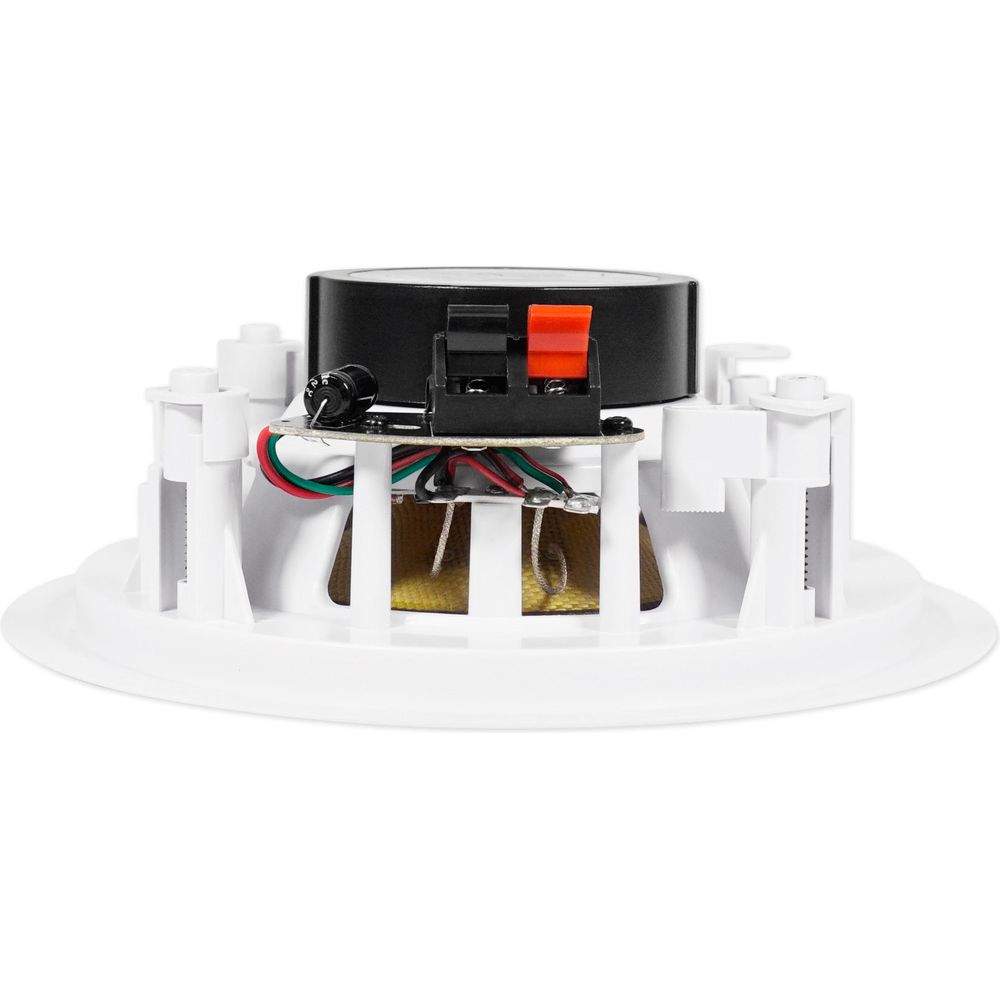 These in-ceiling speakers feature a 6.5” kevlar cone for clear, rich mids and deep bass. Rubber surrounds eliminate unwanted distortion, so all your music sounds loud and clear. Our mylar dome tweeter provides clean, crisp highs. Each pair puts out 160 watts RMS and 500 watts of peak power! This is more than enough power to fill large rooms. The included sheer grill enables flush installation and can be painted to match any décor. Our high-quality spring loaded push terminals supply a perfect signal from your amp or receiver.