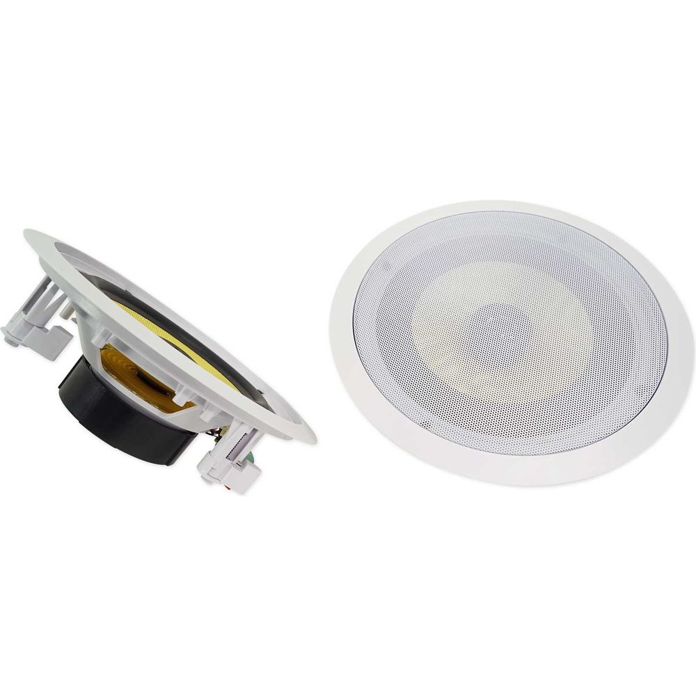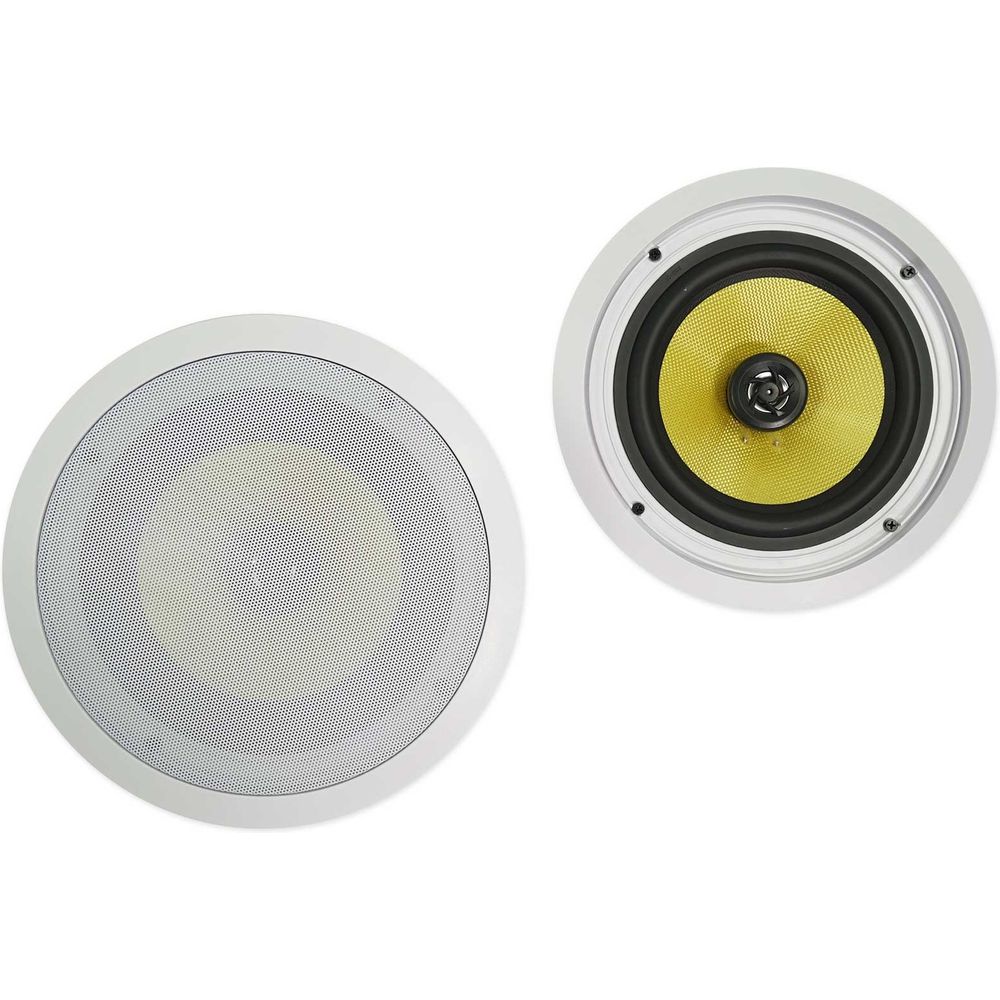 These in-ceiling speakers feature an 8” Kevlar cone for clear, rich mids and deep bass. Rubber surrounds eliminate unwanted distortion, so all your music sounds loud and clear. Our mylar dome tweeter provides clean, crisp highs. Each pair puts out 240 watts RMS and 700 watts of peak power! This is more than enough power to fill large rooms. The included sheer grill enables flush installation and can be painted to match any décor. Our high-quality spring loaded push terminals supply a perfect signal from your amp or receiver.
