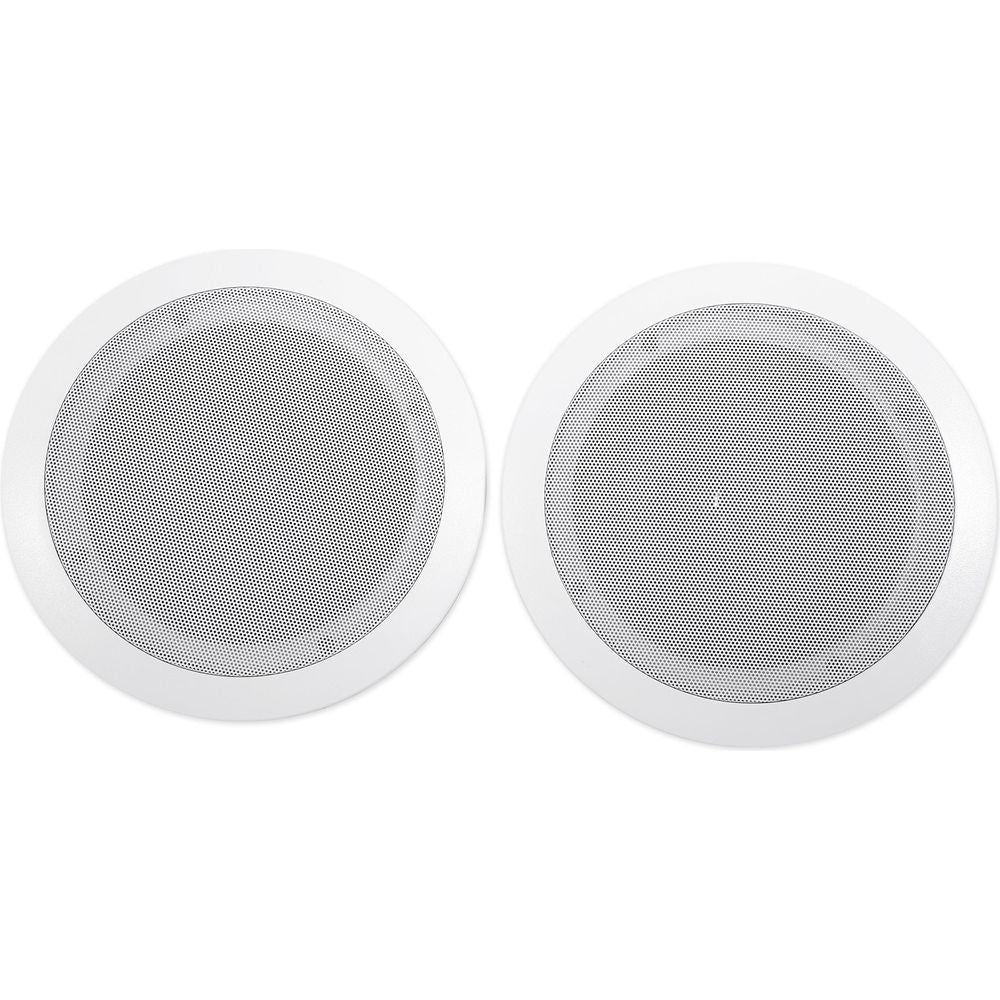 These in-ceiling speakers feature a 6.5" polypropylene cone for clear, rich mids and deep bass. Rubber surrounds eliminate unwanted distortion so all your music sounds loud and clear. Our mylar dome tweeter provides clean, crisp highs. Each pair puts out 160 watts RMS and 500 watts of peak power! This is more than enough power to fill large rooms. The included sheer grill enables flush installation and can be painted to match any décor. Our high quality spring loaded push terminals supply a perfect signal from your amp or receiver.