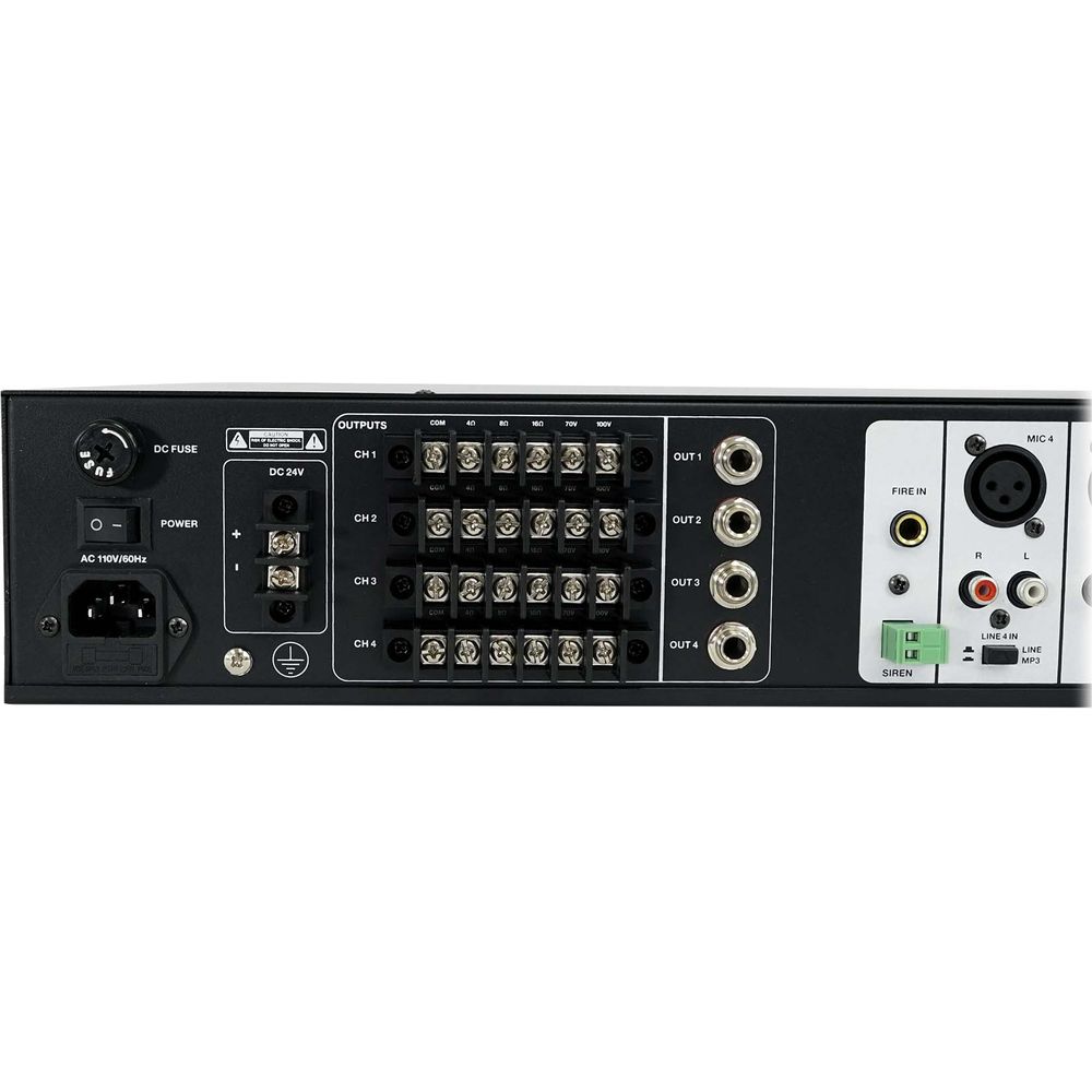 The built-in clipping limiter function protects your speakers and the amp from overheating. For further protection, there is also a cooling system in this amplifier that will keep the components running cool making the amplifier durable and reliable. There is a Fire input and a Siren input. This allows you to easily integrate a fire alarm and play a pre-recorded message that will override any music playing in case of an emergency. There is also a backup DC24V power input that allows you to connect a backup 24V battery that will kick in and power the unit in case of a power outage.