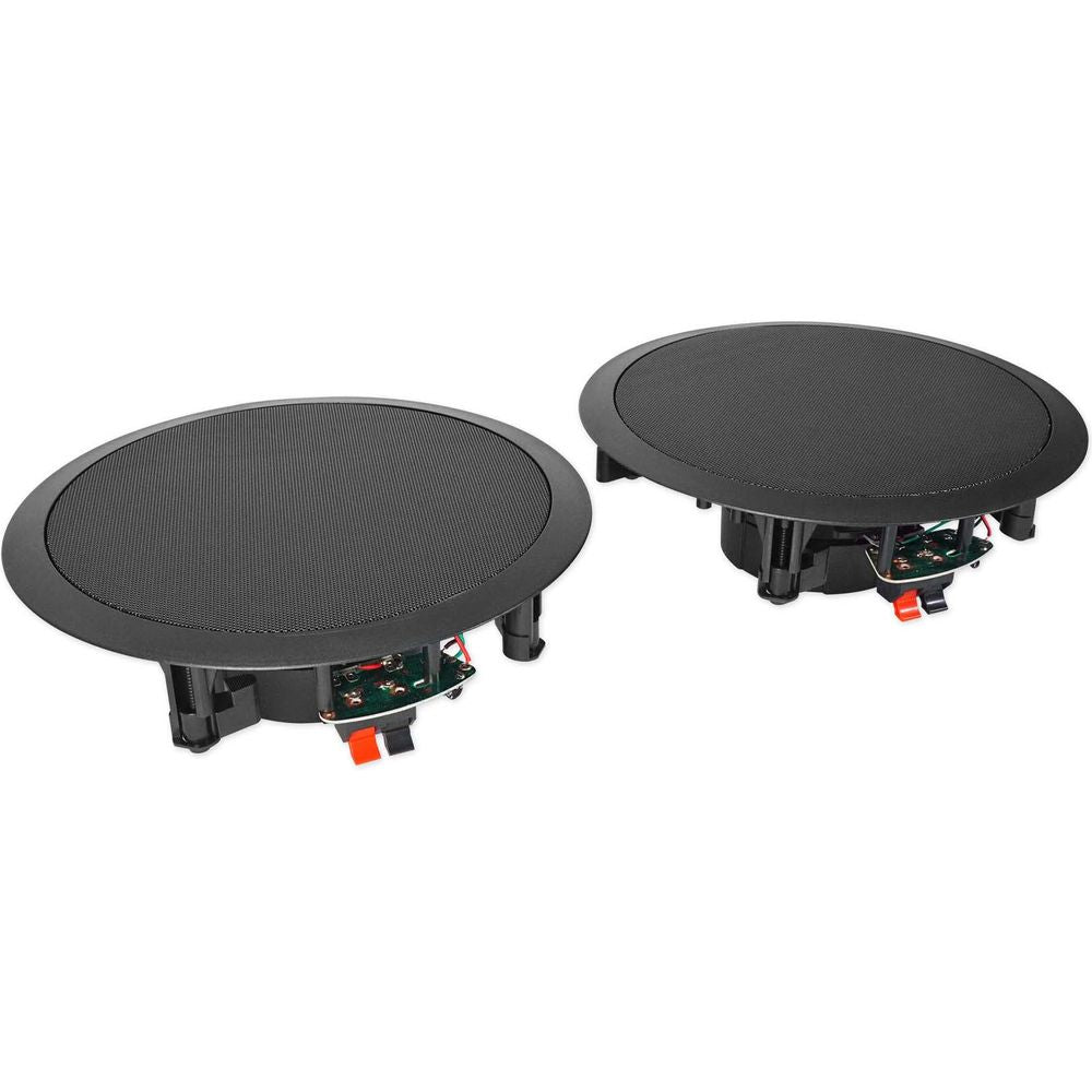 These in-ceiling speakers feature an 8" polypropylene cone for clear, rich mids and deep bass. Rubber surrounds eliminate unwanted distortion so all your music sounds loud and clear. Our Mylar dome tweeter provides clean, crisp highs. Each pair puts out 240 watts RMS and 700 watts of peak power! This is more than enough power to fill large rooms. The included sheer grill enables flush installation and can be painted to match any décor. Our spring loaded push terminals are gold plated and supply a perfect signal from your amp or receiver.