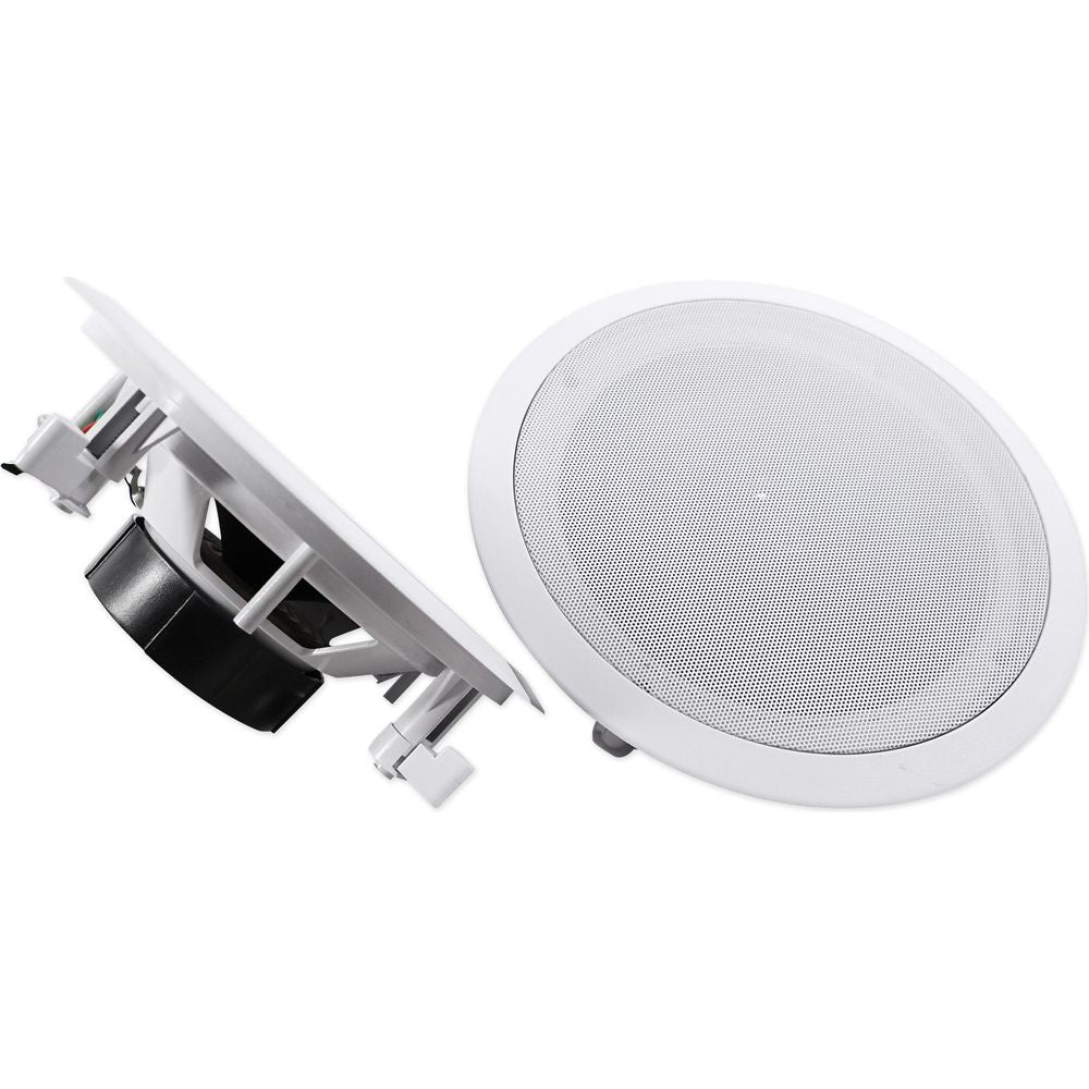 These in-ceiling speakers feature an 8" polypropylene cone for clear, rich mids and deep bass. Rubber surrounds eliminate unwanted distortion so all your music sounds loud and clear. Our Mylar dome tweeter provides clean, crisp highs. Each pair puts out 240 watts RMS and 700 watts of peak power! This is more than enough power to fill large rooms. The included sheer grill enables flush installation and can be painted to match any décor. Our spring loaded push terminals are gold plated and supply a perfect signal from your amp or receiver.