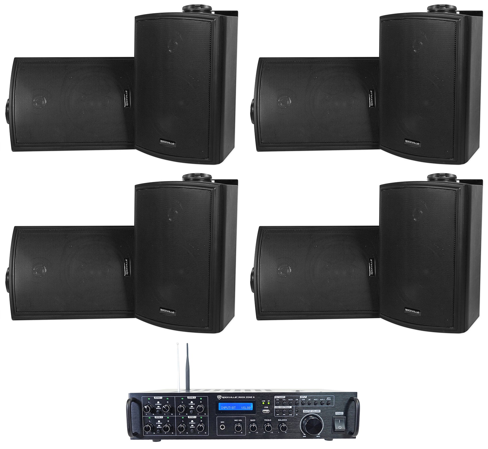 Rockville Rock Zone 8 Ch. Multi Room Home Receiver+8) Black 5.25" Wall Speakers