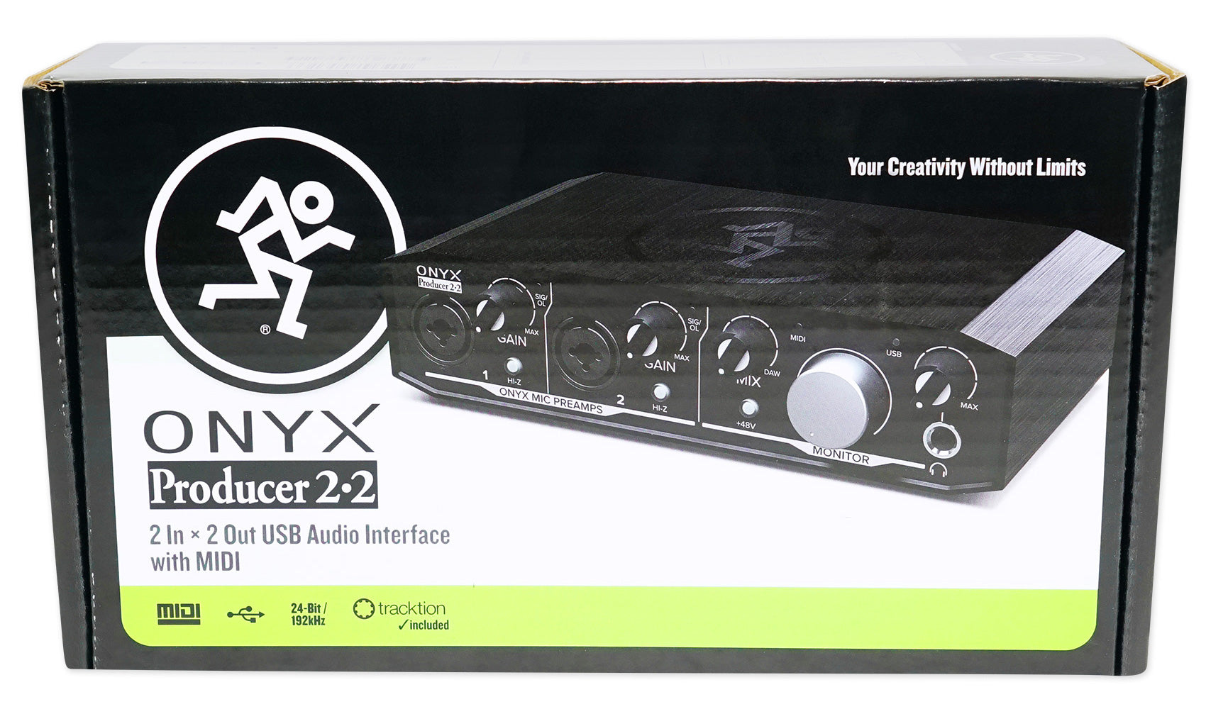 Combining high-resolution 24-bit/192kHz converters with premium Mackie analog circuit and Built-Like-A-Tank™ hardware design, the bus-powered Onyx™ Producer 2•2 is perfect for home studios, mobile recording, and dual mic applications. Featuring two XLR/TRS combo inputs with Onyx mic pres, each is equipped with phantom power and Hi-Z instrument switches for maximum versatility. Plus, with zero-latency direct analog monitoring ensures you can always hear yourself in real time. It also has built-in MIDI I/O for controllers, synths, and more. With the Onyx Producer 2•2, you have the power to capture your performance and experience media with pristine fidelity at home or on the go. Your Creativity Without Limits – Onyx Series USB Audio Interfaces.