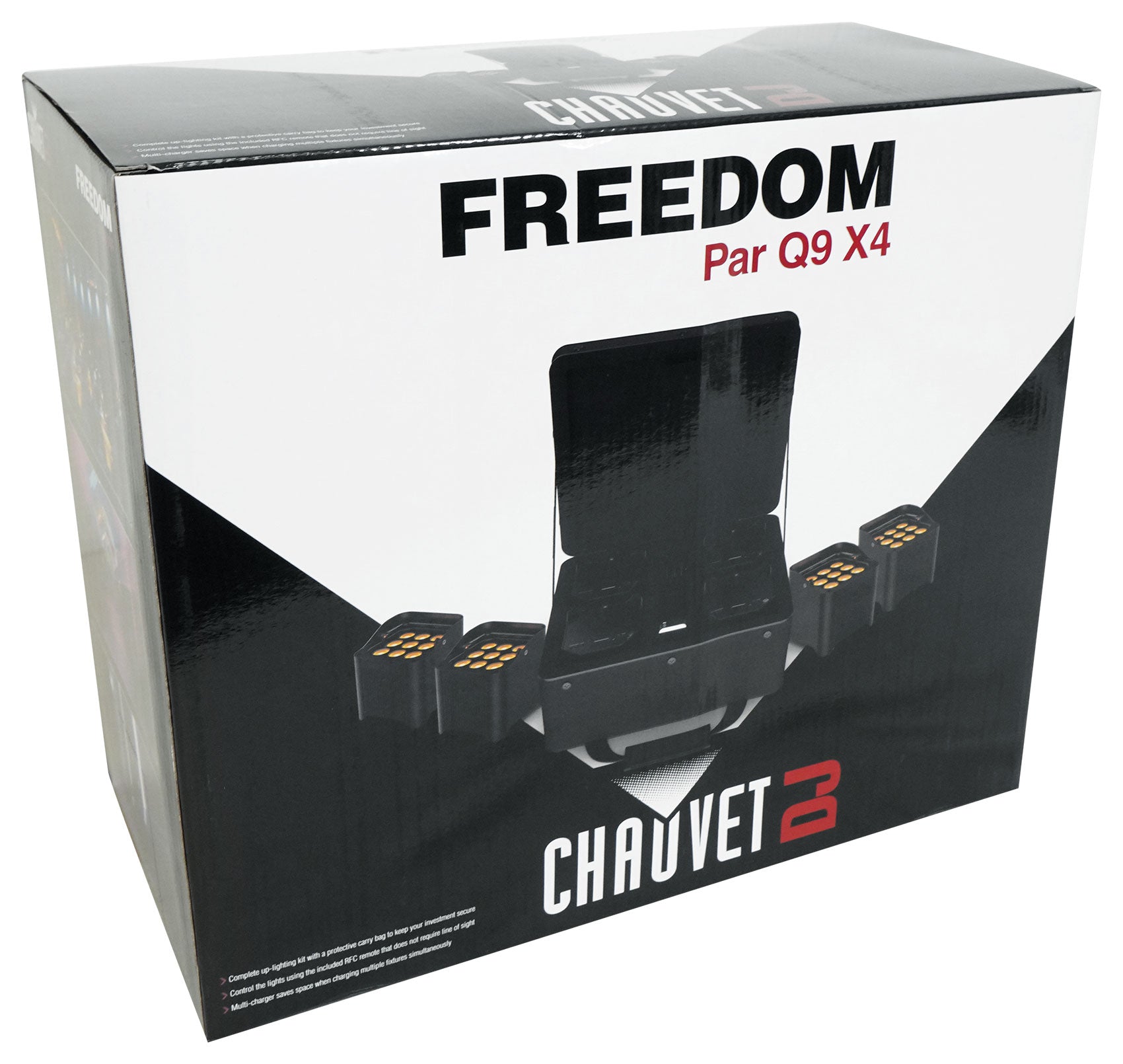 Convenience and protection come in this complete lighting kit that includes four Freedom Par Q9, an RFC remote for control, and a multi-charger that saves space when charging multiple fixtures simultaneously - all in a protective carry bag.