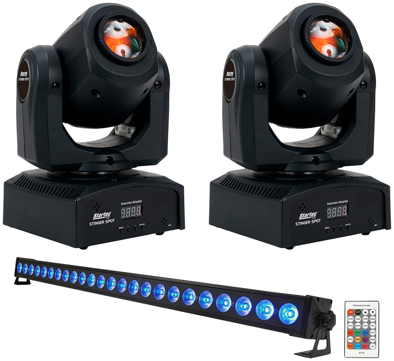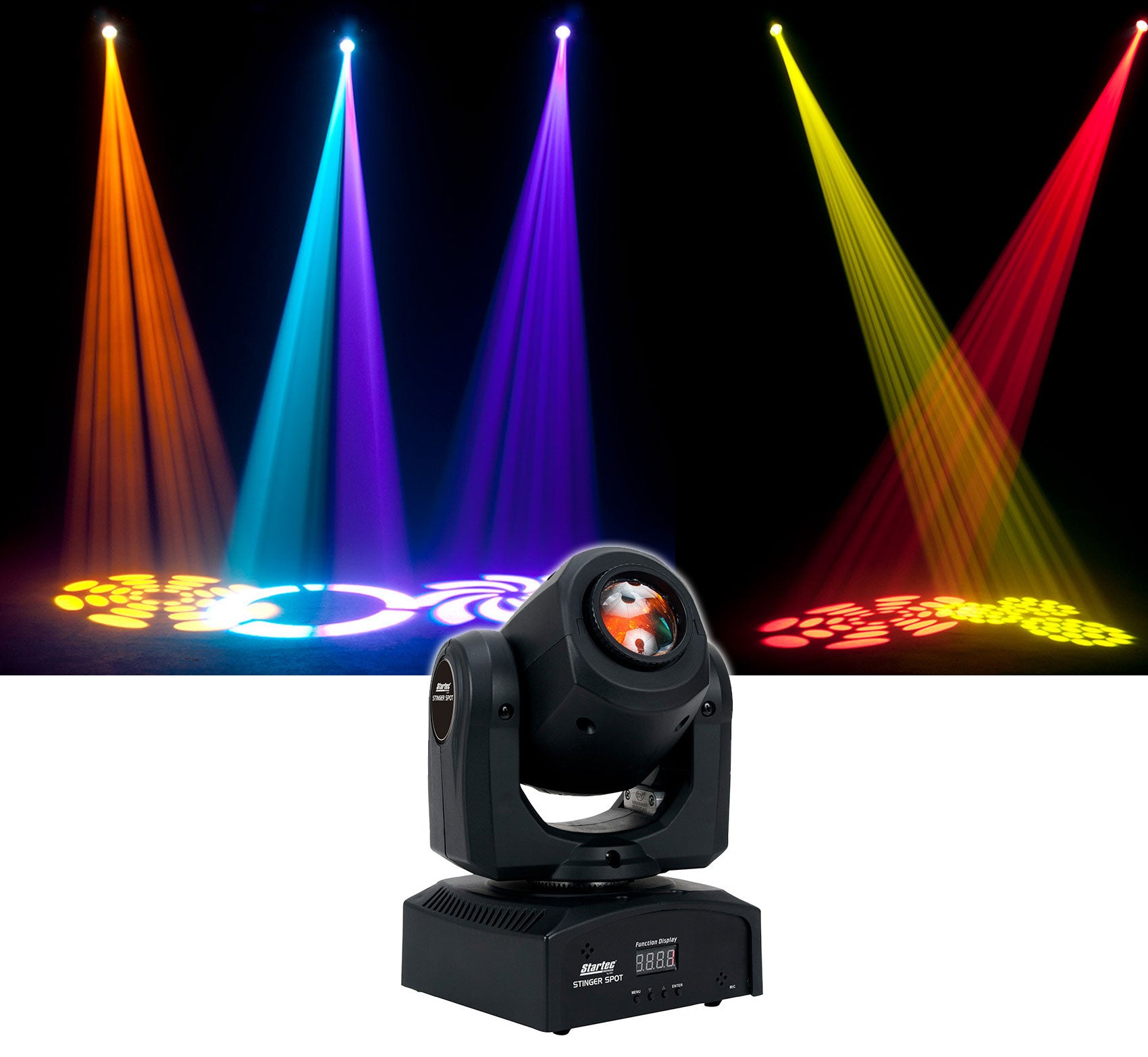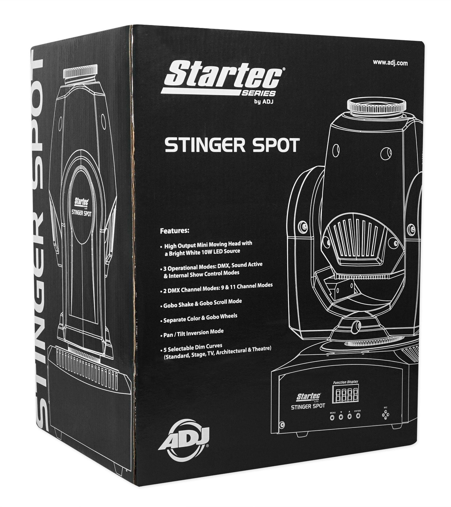The Startec Stinger Spot* is a mini Moving Head with a bright 10-Watt LED source and advanced optics. Its compact size and lightweight makes it ideal for mobile entertainers, small club and bars, roller rinks, bowling centers or any mobile production.