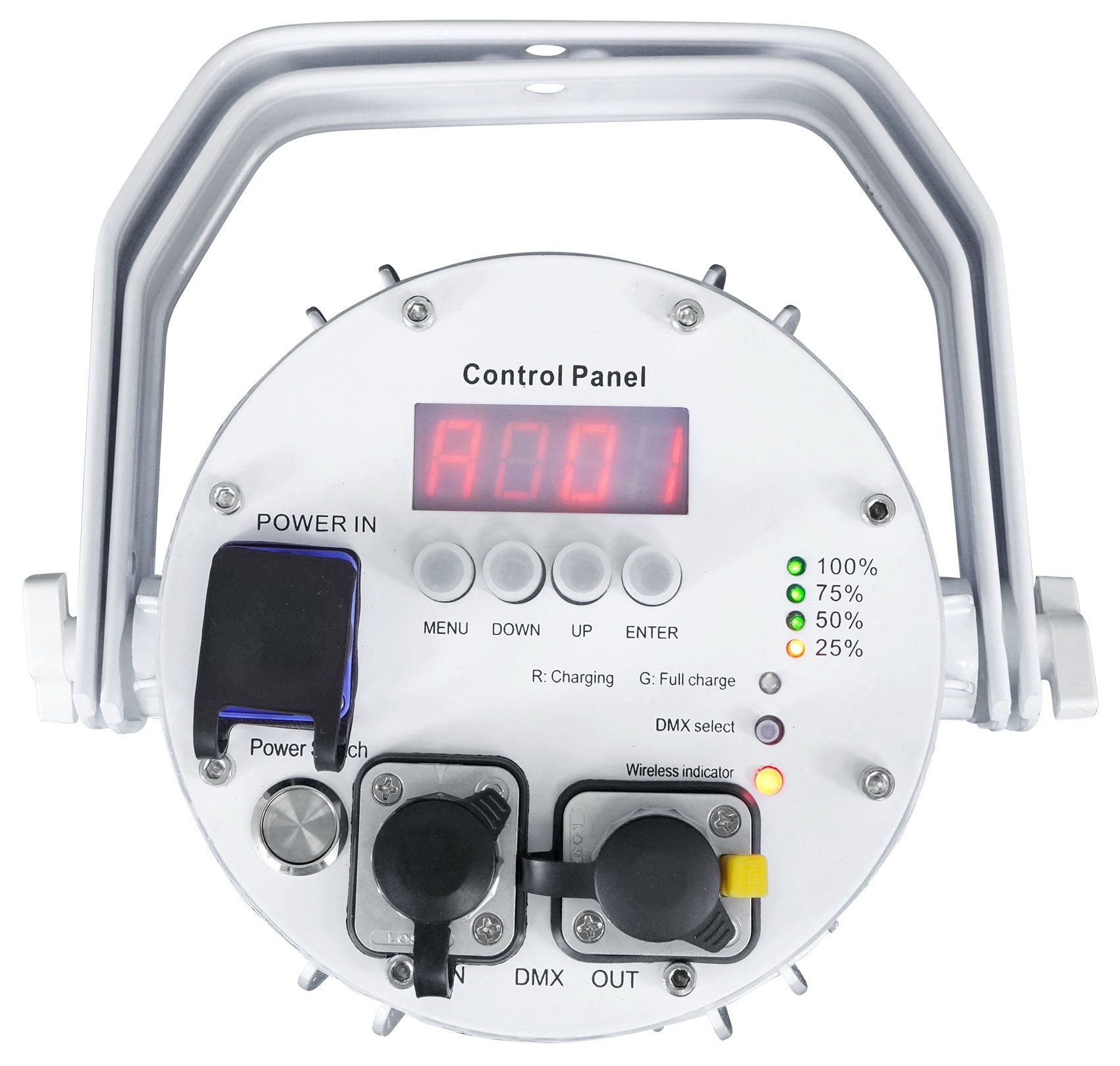 This light is fully wireless including wireless DMX controls and a wireless remote.