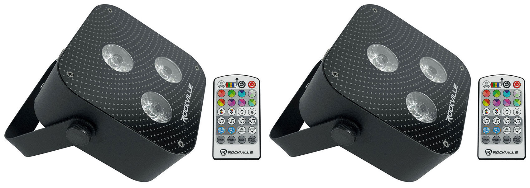 - (2) Rockville MINI RF3 Black RGBWA+UV DJ/Party LED Wash Light+4-Ch. RF Par Remote
