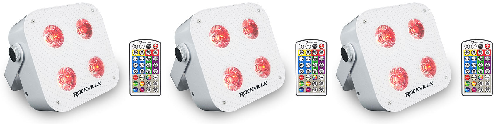 - (3) Rockville MINI IR4 White RGBWA+UV DJ/Party Par Wash Up Light+Wireless DMX+App