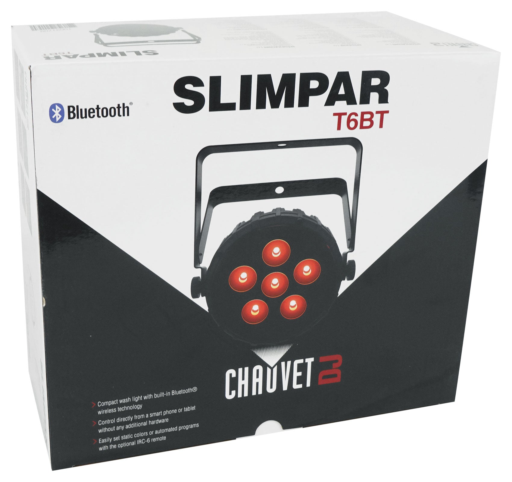 SlimPAR T6BT is a low profile, high output wash light featuring six tri-color (RGB) LEDs and built-in Bluetooth® wireless technology. Enjoy easy lighting control of SlimPAR T6BT from any smartphone or tablet using BTAir. SlimPAR T6BT is an excellent front light for bands, and switching lighting looks at the touch of a button on a mobile device allows hands to quickly return to musical instruments. Mobile DJs can program orchestrated light shows using Master/Slave and DMX, or simply entertain with SlimPAR T6BT’s built-in automated programs accessible via the optional IRC-6 remote. Flicker-free output makes SlimPAR T6BT an ideal wash light for broadcast streaming applications, and power linking multiple units saves time running cables. Lightweight, compact SlimPAR T6BT easily fits inside sticks of TRUSST, as well as the CHS-30 VIP Gear Bag for safe gig-to-gig transport.