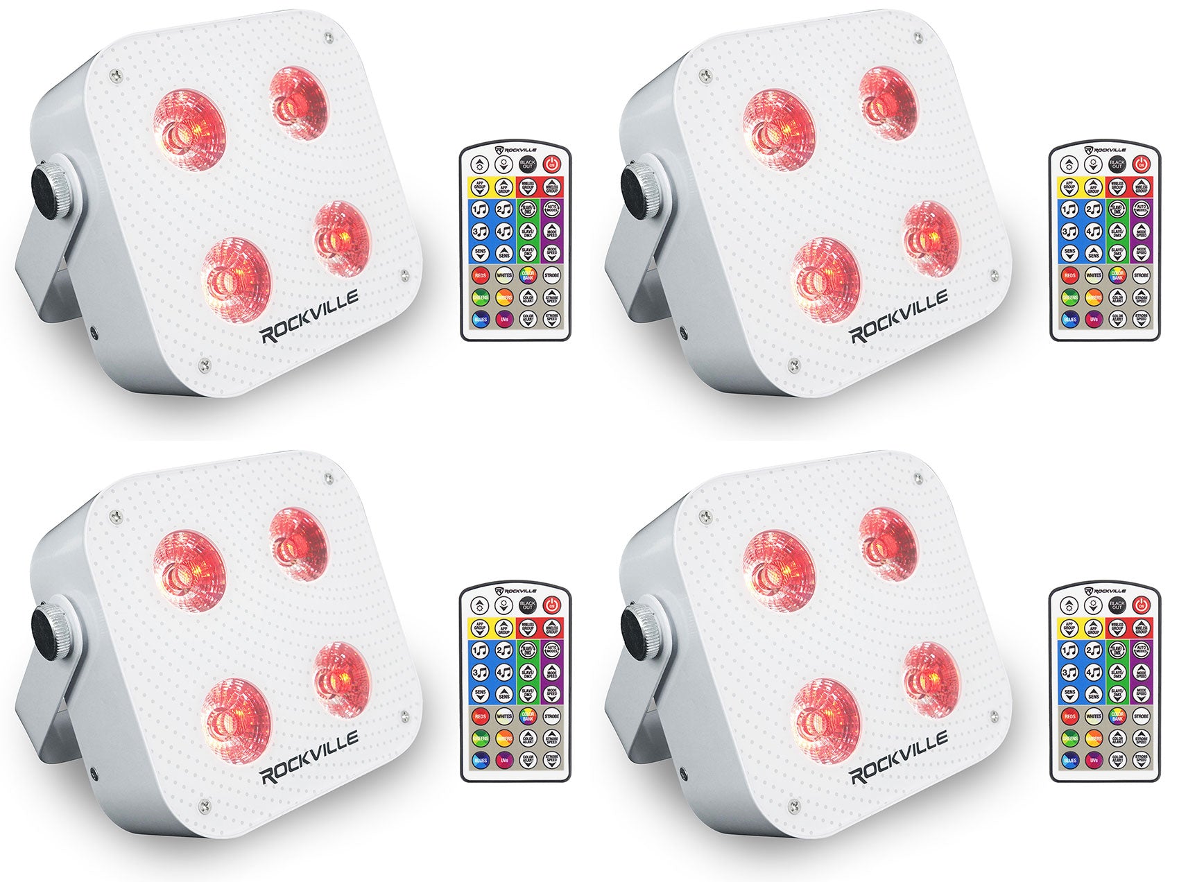 - (4) Rockville MINI IR4 White RGBWA+UV DJ/Party Par Wash Up Light+Wireless DMX+App