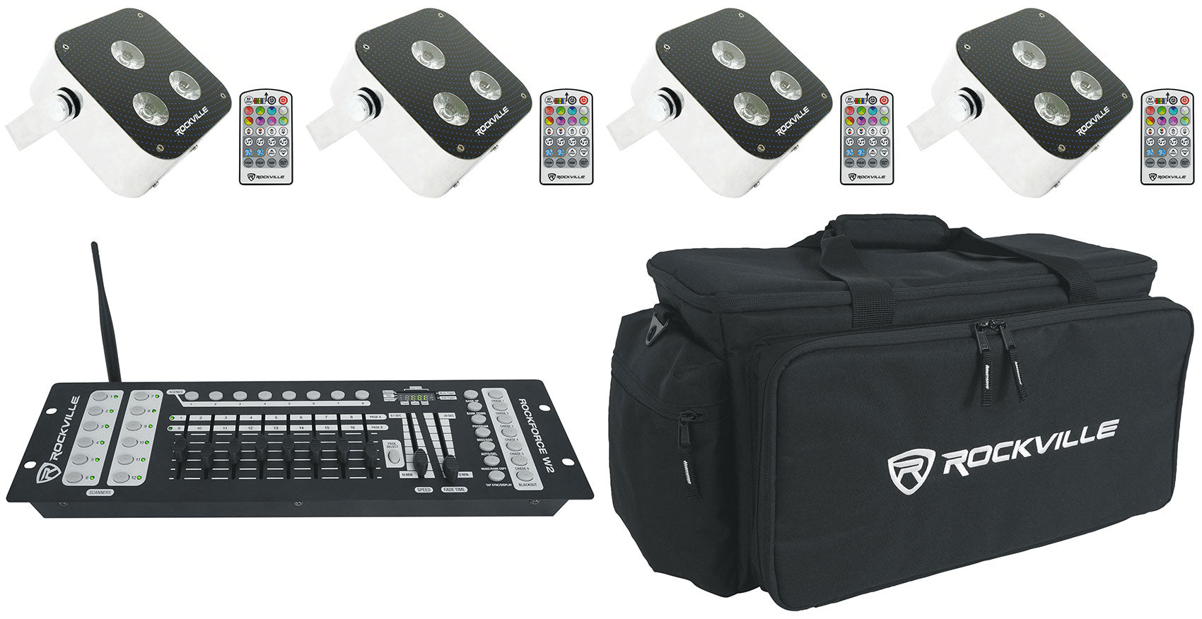 - (4) Rockville MINI RF3 RGBWA+UV DJ/Party LED Wash Light+4ch RF Long Range Par Remote
