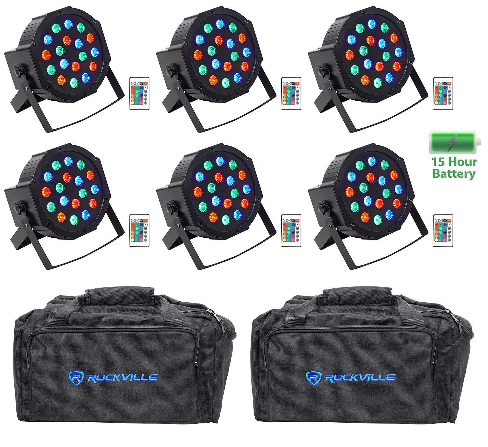 (6) Rockville BATTERY PAR 50 Rechargeable LED DMX DJ Wash Up-Lights+Remotes+Bags