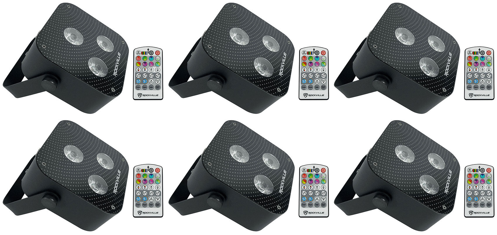 - (6) Rockville MINI RF3 Black RGBWA+UV DJ/Party LED Wash Light+4-Ch. RF Par Remote