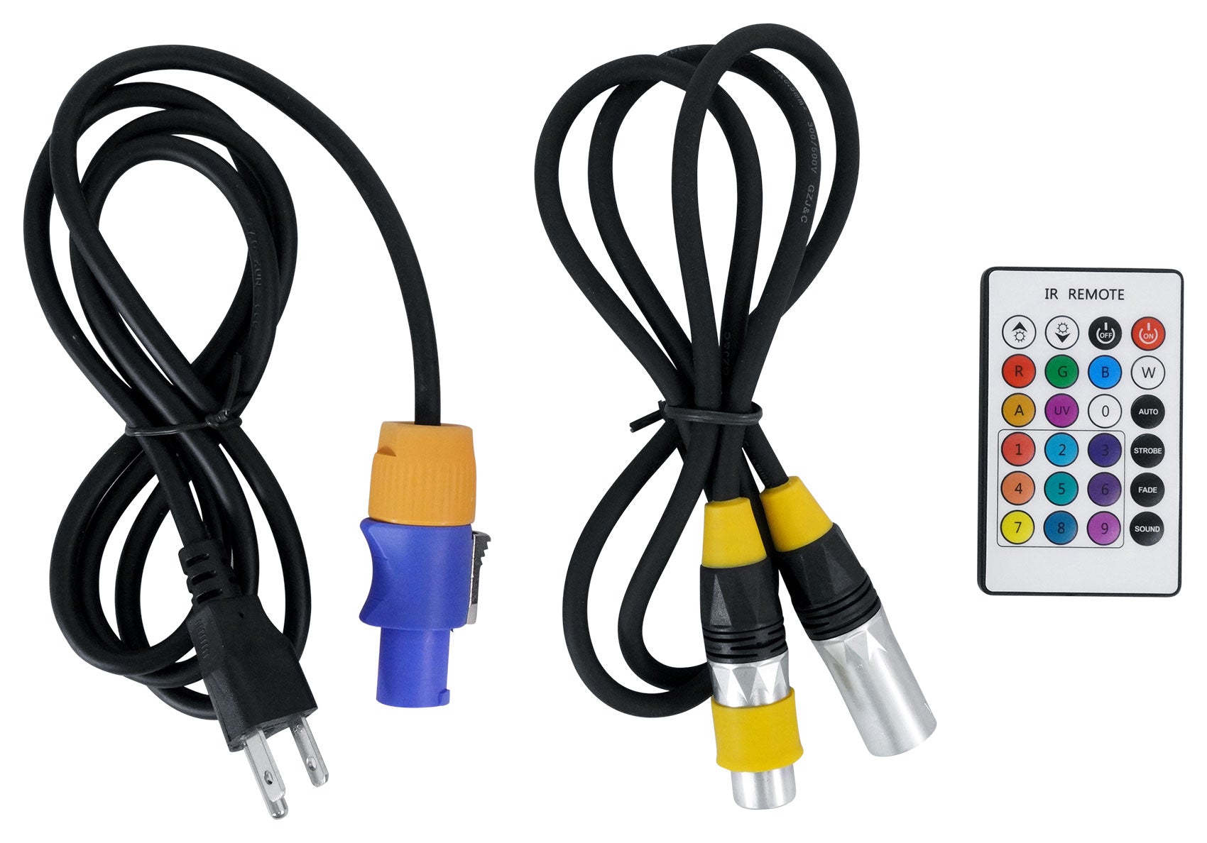 This light is fully wireless including wireless DMX controls and a wireless remote.