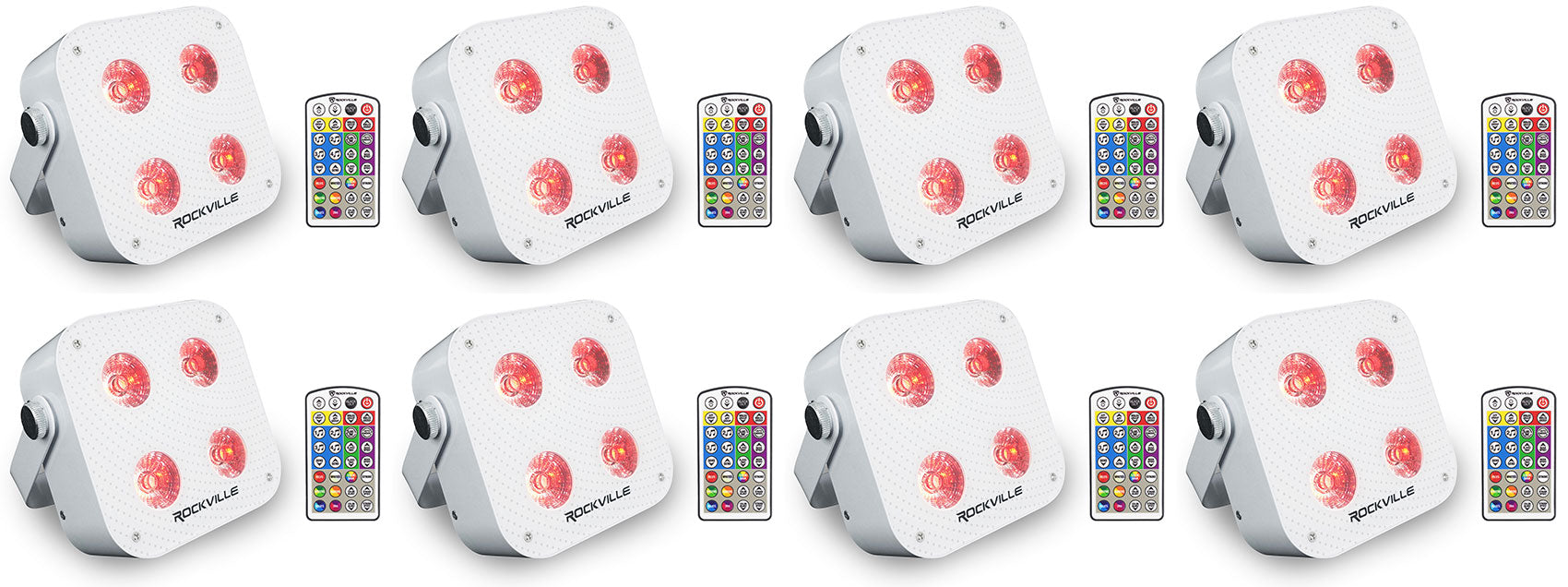 - (8) Rockville MINI IR4 White RGBWA+UV DJ/Party Par Wash Up Light+Wireless DMX+App