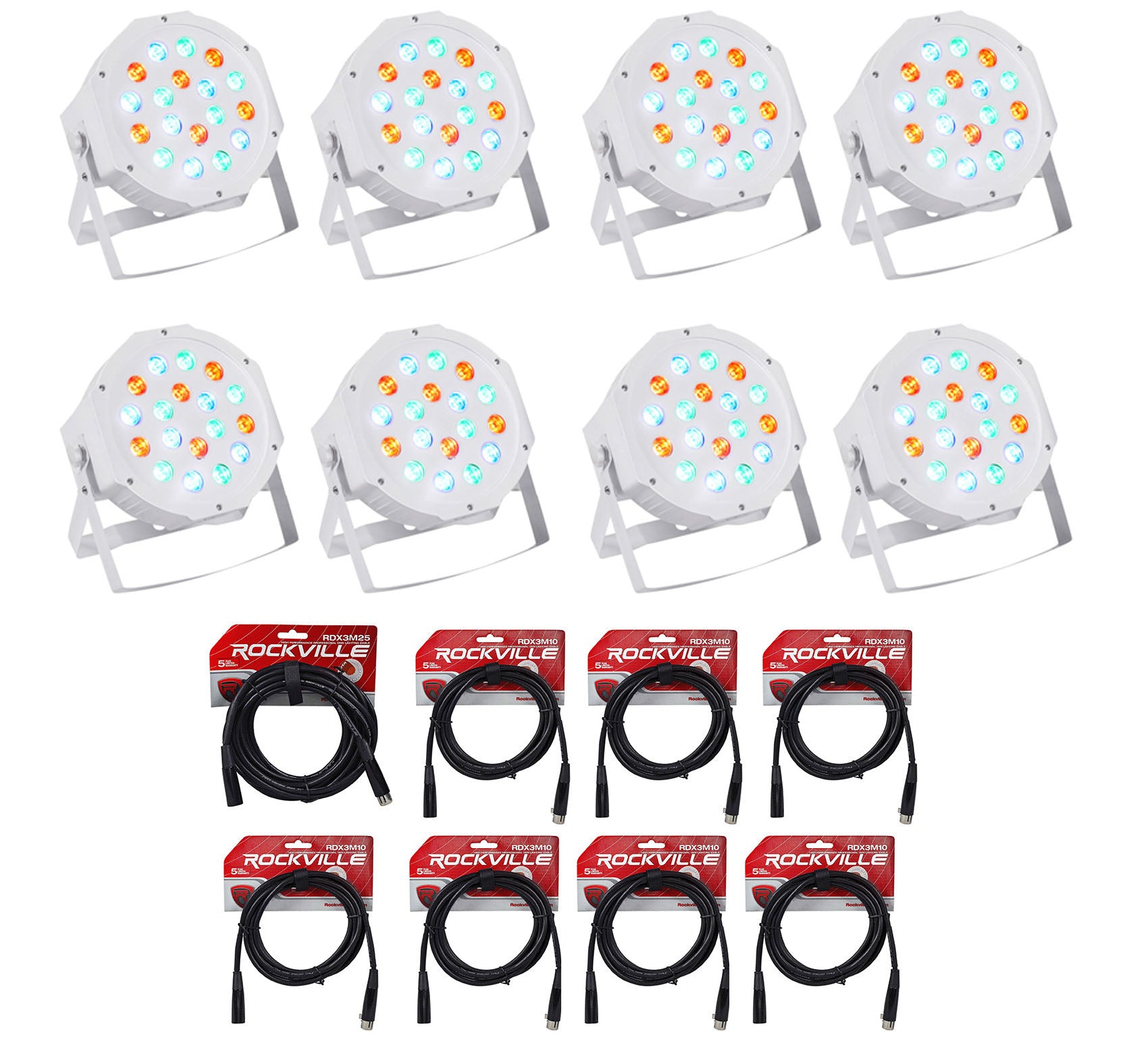 (8) Rockville RockPAR50 WHT LED RGB Par Can DJ/Club DMX Wash Lights+Cables