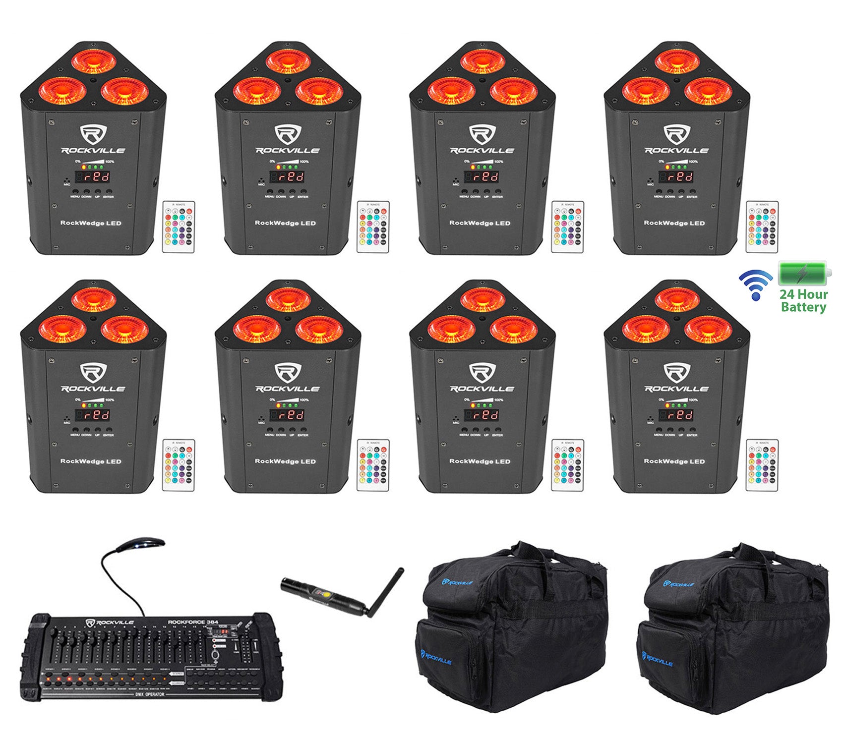8) Rockville RockWedge LED RGBWA+UV Rechargeable Wireless DMX Lights+Control+Bag