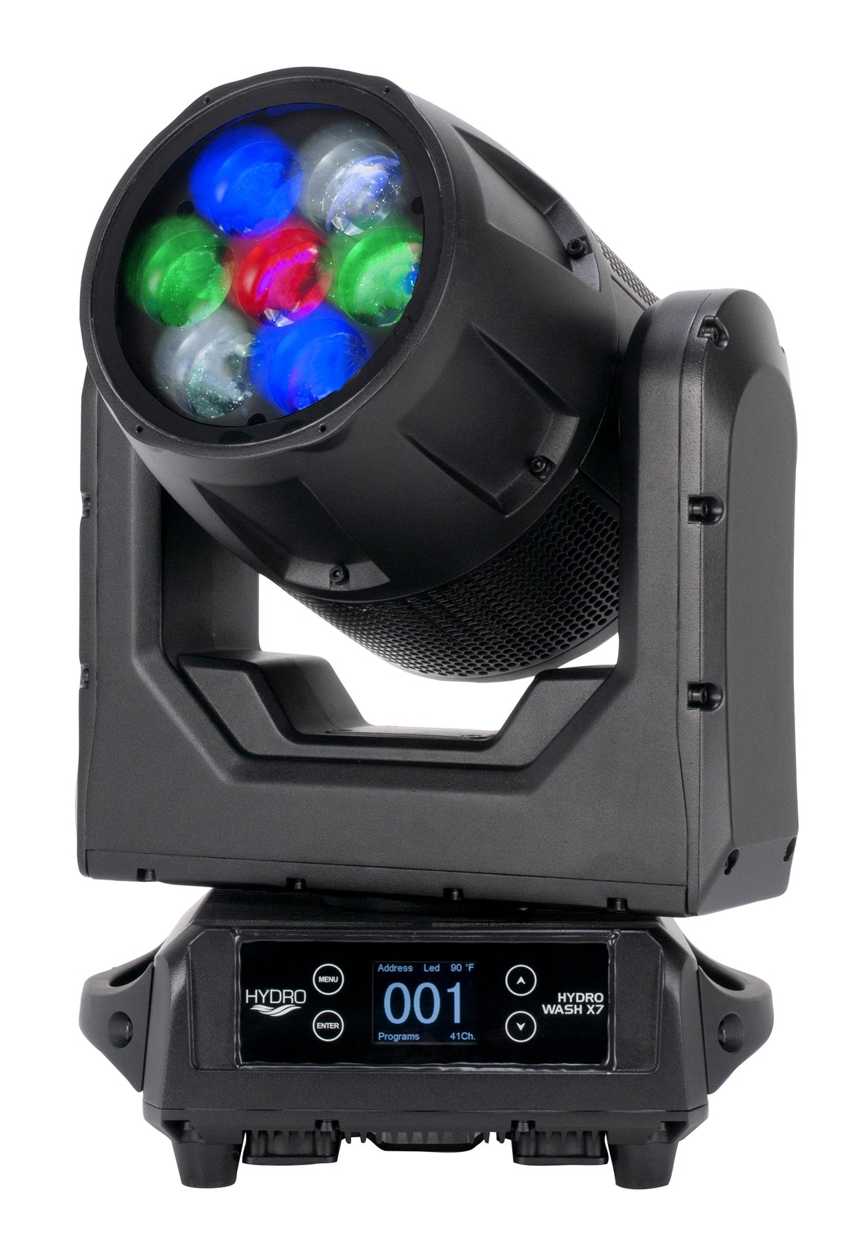 The ADJ Hydro Wash X7 is an IP65 rated 280W professional moving head wash fixture with seven 40W RGBW (4-IN-1) LEDs.