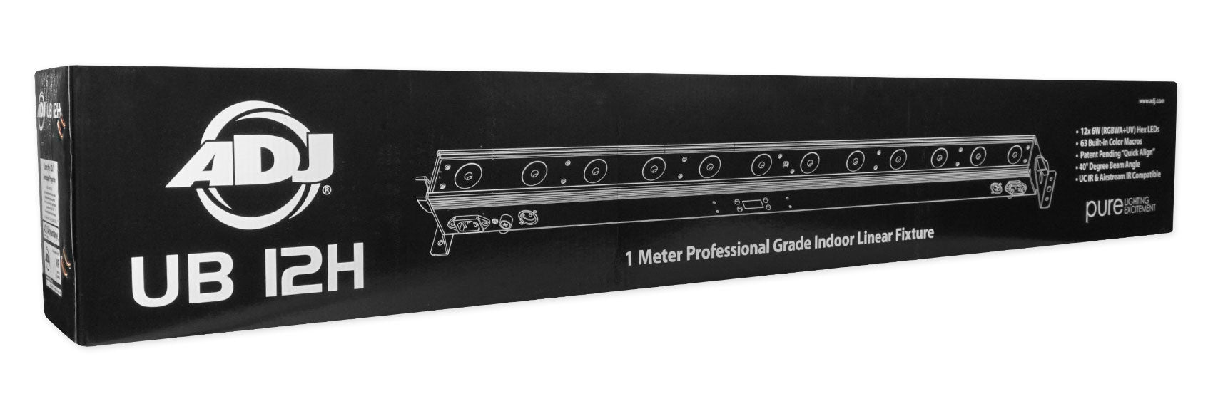 The ADJ UB 12H is a 41.75-inch (1-meter) professional grade indoor linear fixture powered by twelve 6-Watt HEX (6-IN-1) LEDs. Its bright chromatic 40-degree beam angle provides vibrant TRI color mixing designed for washing stages, walls and dance floors. Its rugged casing with patent pending Quick Align end locking allows for a seamless output of light with no breaks of color.