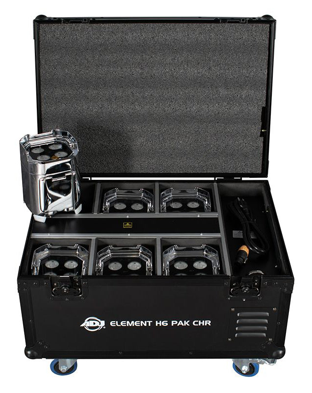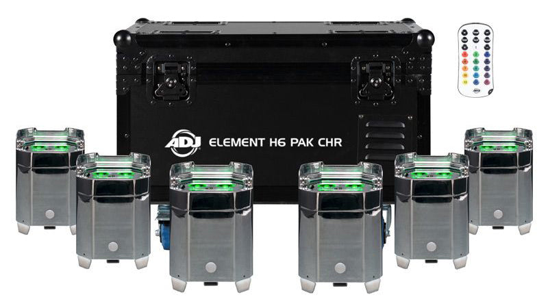 The ADJ Lighting Element H6 Pak Chr is an all-in-one event up lighting system with (6) IP54-Rated battery powered chrome fixtures in a durable flight case with on-board battery charging solution. Includes one UCIR24 wireless remote. Suitable for indoor and temporary outdoor use.