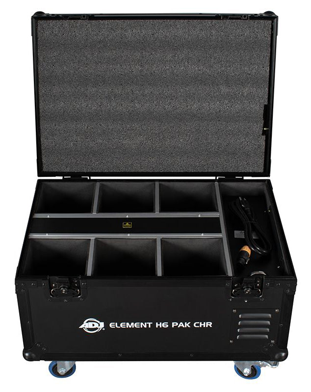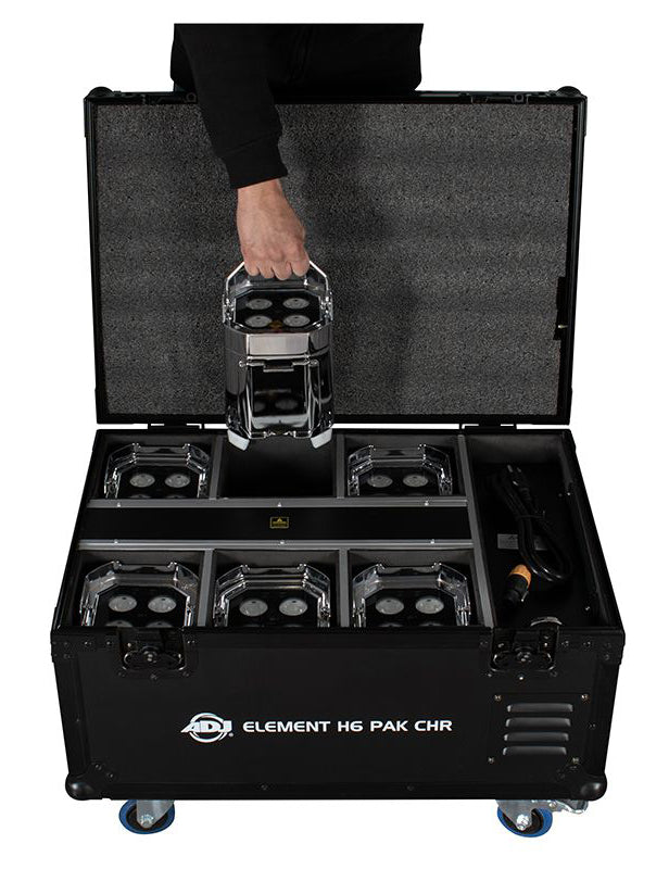 - 6x Element H IP Chr Fixtures (Chrome fixtures) packaged in an Element H6 FC (powered battery charging flight case) with IR remote