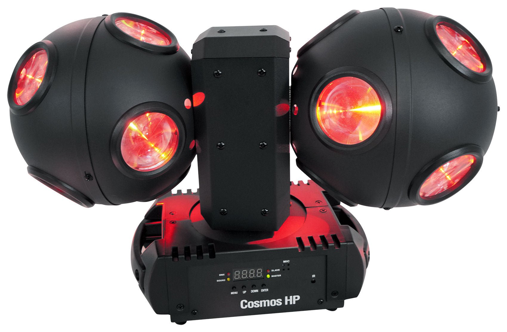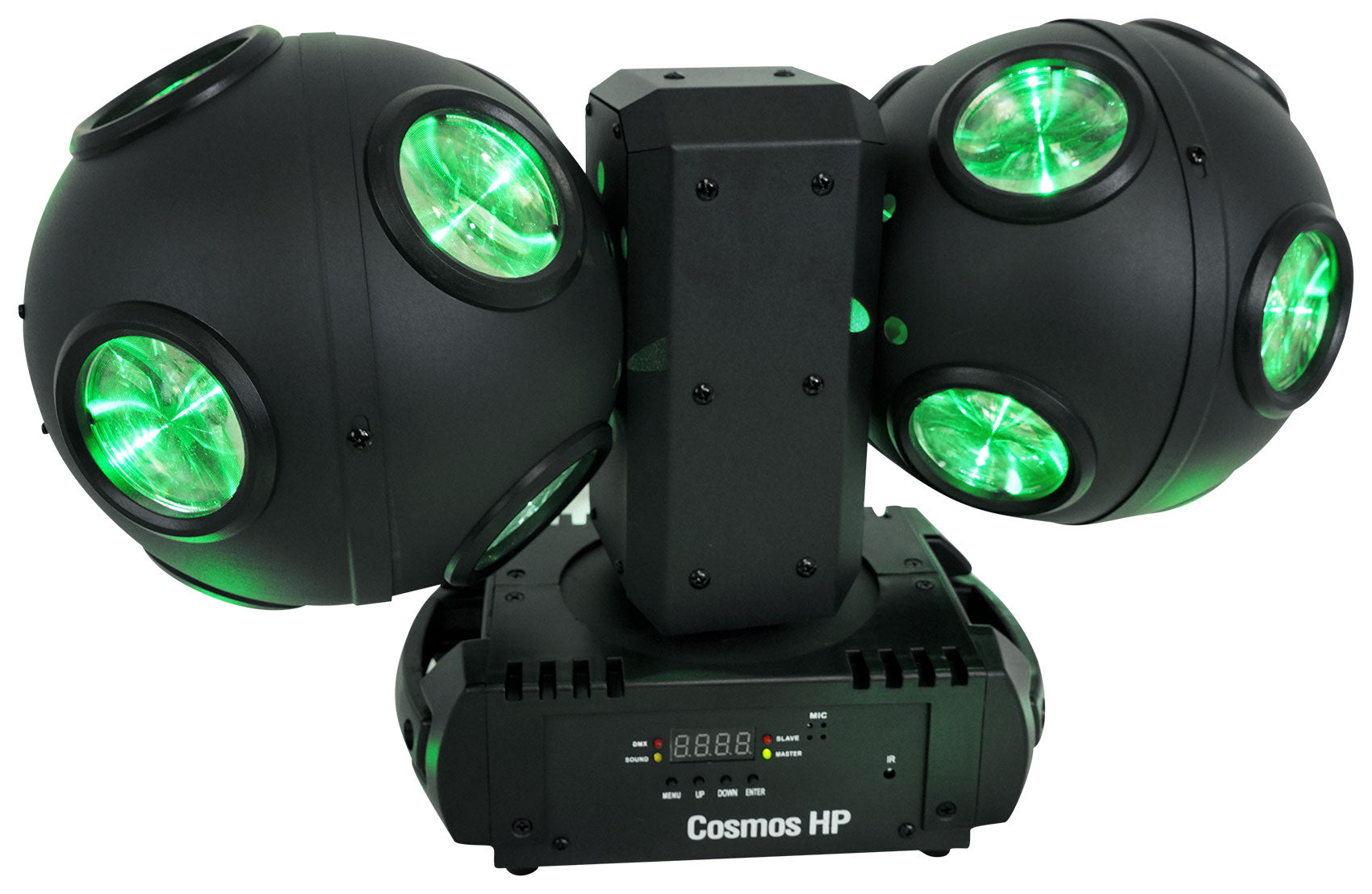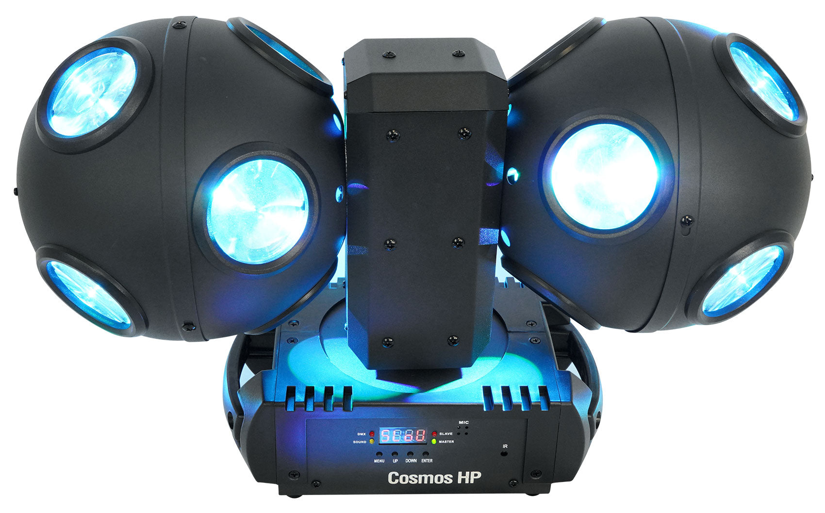 Blast into a whole new universe of dance floor energy with Cosmos HP, a high-powered LED effect light that generates breathtaking razor-sharp beams of RGBW light for astonishing aerial effects that cover the entire room and look amazing with or without haze. Independently controlled motors spin two LED filled balls continuously in different directions creating stunning swirling effects. Generate complex looks easily with built-in, eye-catching auto programs with zone control and use an optional IRC-6 wireless remote for convenient, wireless control.