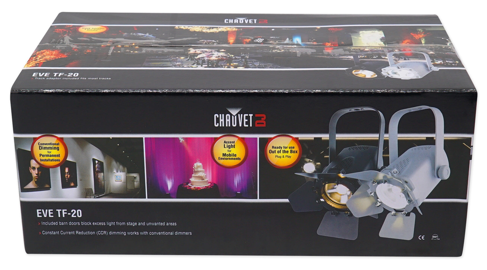 EVE TF-20 is a compact, energy efficient, soft edge LED accent luminaire that can function as a regular PAR can, while its classic Fresnel style emulates stage and theatrical lighting. Conveniently included barn doors block light from unwanted areas, letting you focus on a particular space or object. Thanks to its CCR (Constant Current Reduction) LED dimming, it works seamlessly with conventional dimmers, and is flicker-free in filmed productions. MET certified, it is designed for mobile and installation applications and it is equally suited for new and retrofit installations via the included track adaptor as it is for mobile use right out of the box using its standard power cord.