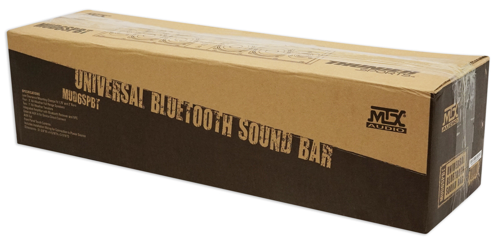 The MTX MUD6SPBT is a universal sound bar solution that is designed to deliver exceptional audio quality to any vehicle. This all-in-one unit includes six total speakers, four 3" full range drivers and two 1" high frequency tweeters. All speakers are connected to an internal power amplifier that delivers all of the power you need to hear your music whether you are on land or water.