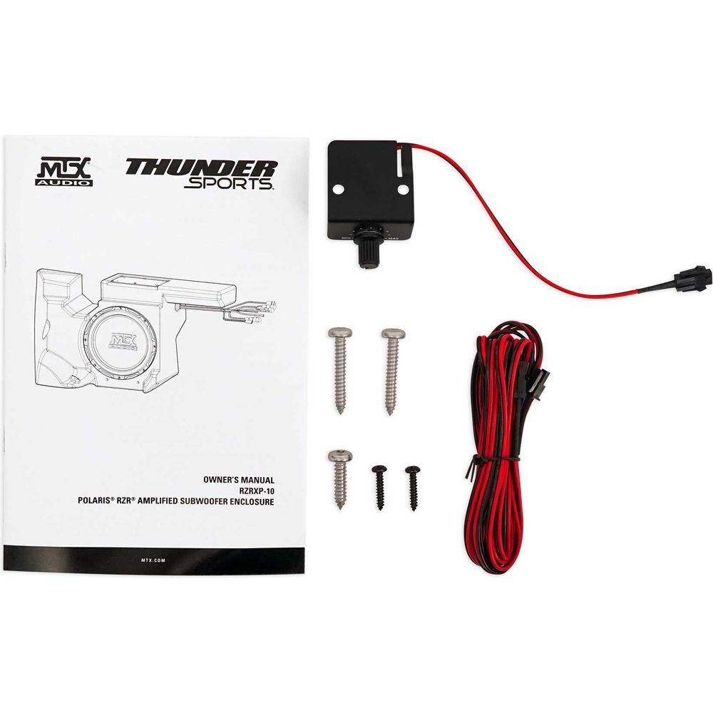 The MTX RZRXP-10 is a subwoofer enclosure designed to mount directly under the dash of specific Polaris RZR models. The subwoofer enclosure is rotationally molded using linear low density polyethylene (LLDPE) creating a durable finish that is weather resistant and durable. The enclosure mounts under the dashboard using existing mounting locations and does not require any cutting or drilling to install. The enclosure includes a 10" weather resistant 250-watt RMS subwoofer featuring a polypropylene cone that delivers exceptional low frequency output. The unit includes an integrated 250-watt class D amplifier that only requires power and signal. This saves riders from having to purchase a separate amplifier to power their enclosure and to find a place to mount it. The MTX RZRXP-10 is self-contained and ready to deliver the bass that MTX is known for.
