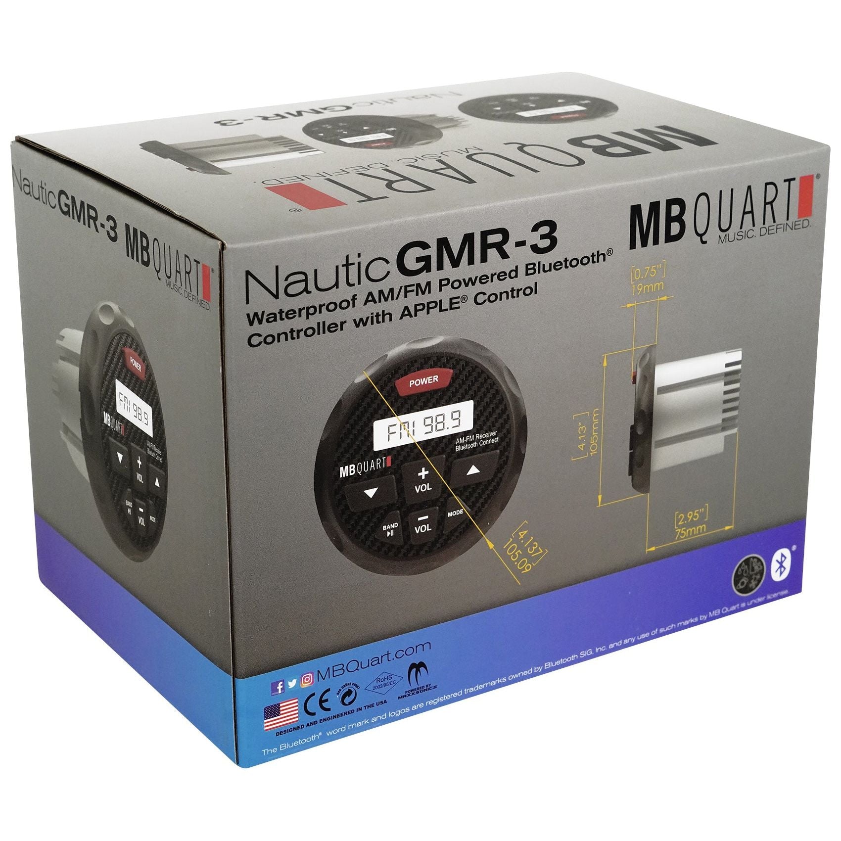 MB Quart GMR-3, Bluetooth AM/FM gauge mount radio featuring Apple control which brings more control between your Apple devices. Internal 4 channel amplifier delivers 180 watts, including aux input and 4 volt pre-amp outputs.
