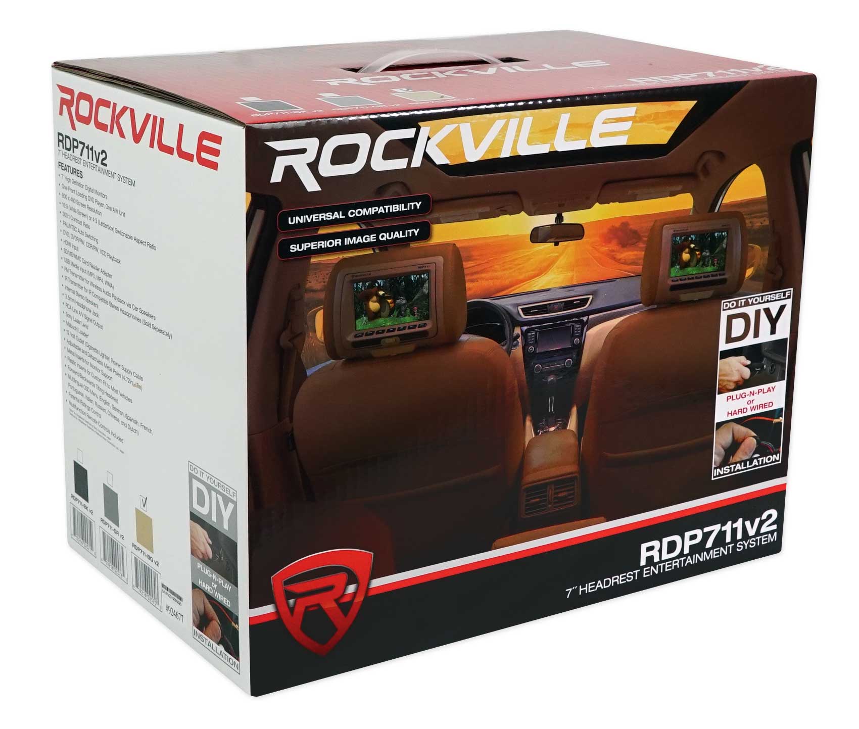 The Rockville RDP711 is a 7" complete car video entertainment system. The RDP711 features a universal fit system and it includes all the necessary parts to fit any vehicle. It has adjustable and detachable metal poles that adjust left to right from 4" inches to 7" inches. Rockville will have you up and running and enjoying your system in almost no time. Installation is very simple. Just power and ground wires. Rockville takes the rocket science out of system integration, with our detailed and easy Do-It-Yourself Instructions. (Our instructions are written so that it is easy to understand). The headrests are manufactured of high quality leatherette with a plush comfortable finish and modeled to integrate perfectly into any vehicle.