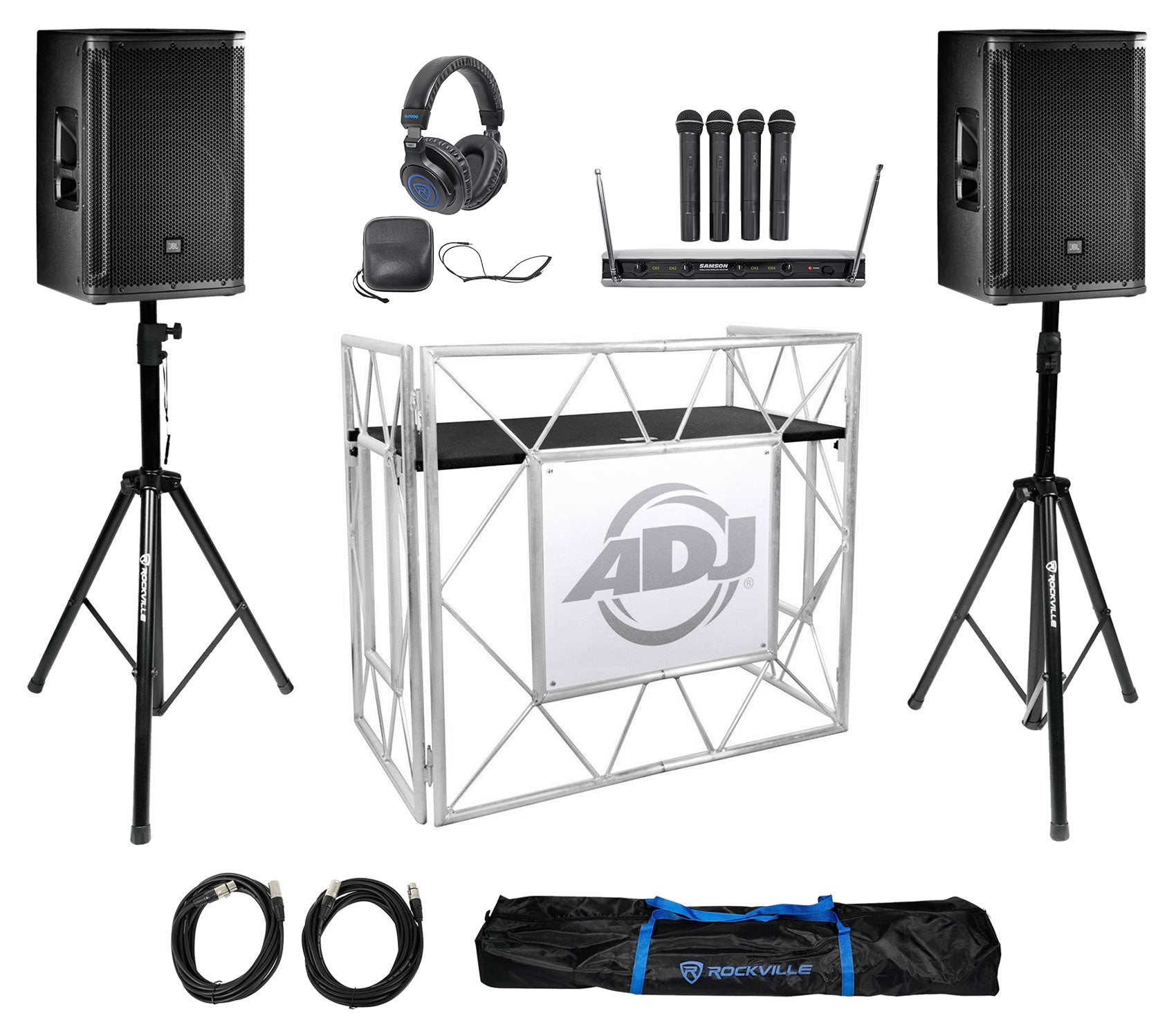 2) JBL SRX812P 12" 2000w Powered DJ Speakers+Stands+Facade+(4) Mics+Headphones