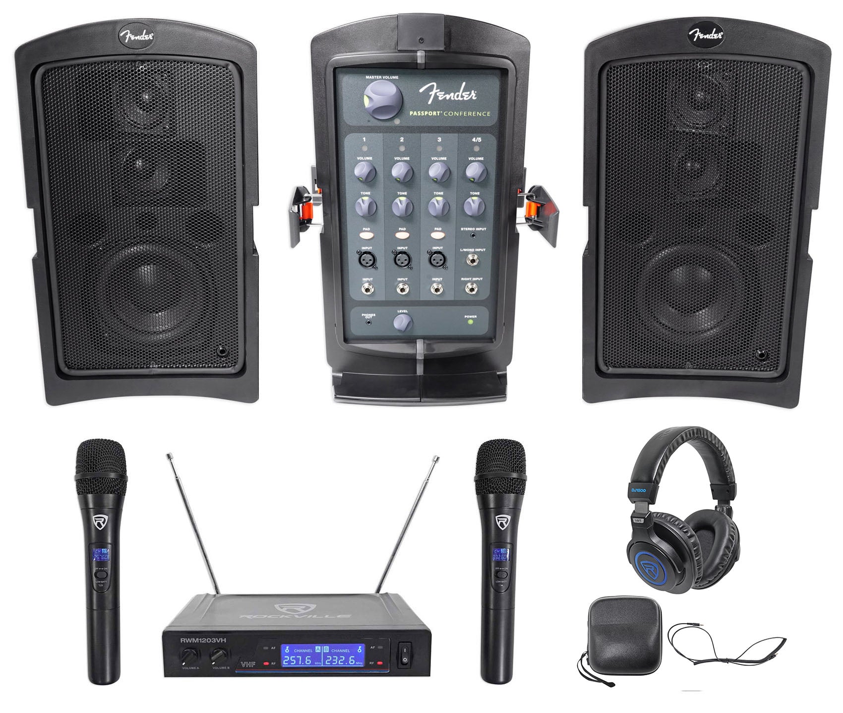 FENDER PASSPORT CONFERENCE Powered 5.25" PA DJ Speakers+Wireless Mics+Headphones