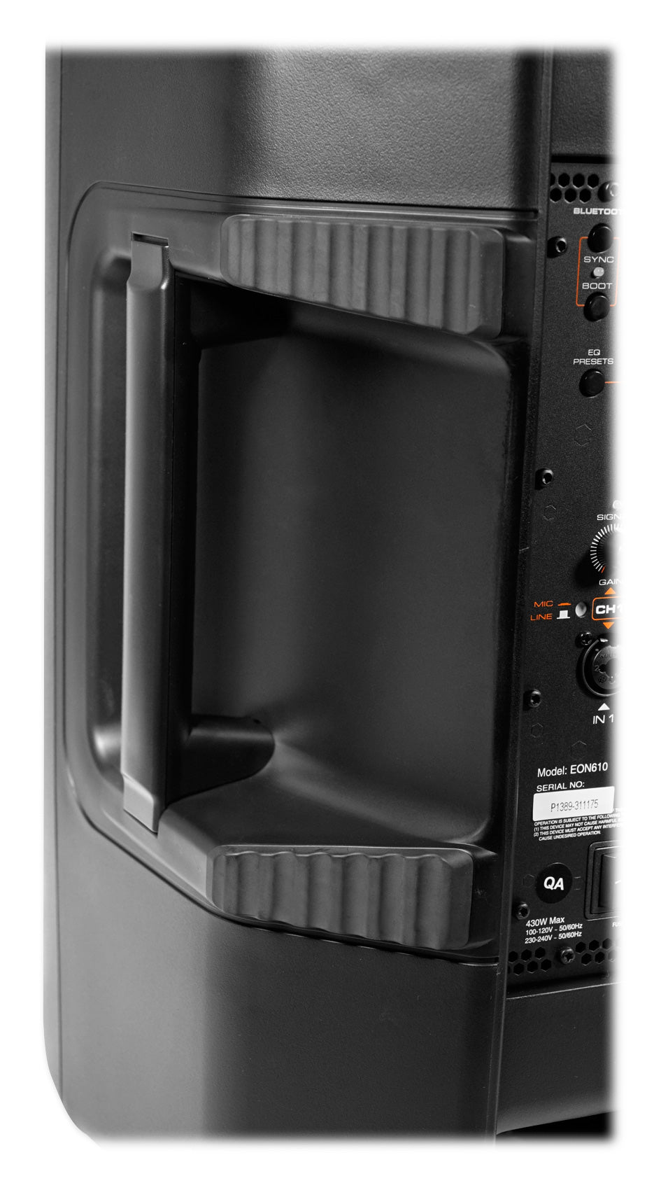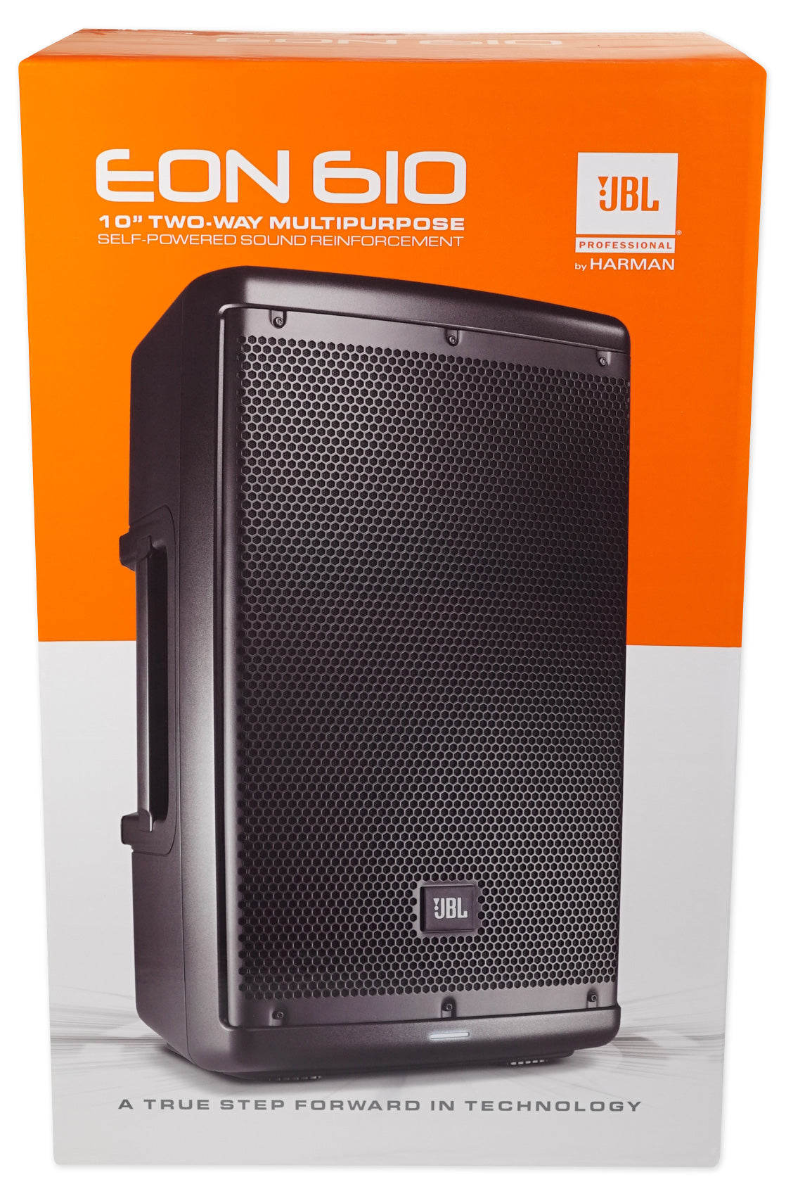 The JBL EON610 is a two-way 1000W peak Class-D amplifier driven live sound reinforcement speaker that combines a wave-guided high-frequency driver with a 10" woofer in a bass-reflex cabinet. The speaker was designed from the ground up by JBL engineers to leverage the latest advancements in cabinet materials, acoustic science, transducer design, and integrated Bluetooth controllable DSP.