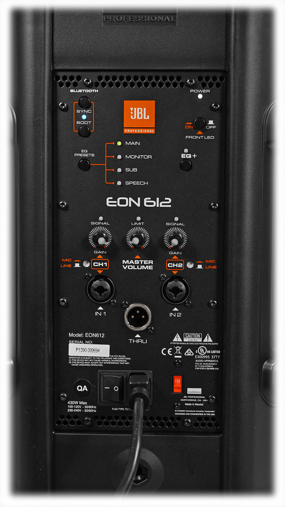The JBL EON612 is a two-way 1000 W peak Class-D amplifier driven live sound reinforcement speaker that combines a wave-guided, high-frequency driver with a 12" woofer in a bass-reflex cabinet for greater low-frequency extension. The speaker was designed from the ground up by JBL engineers to leverage the latest advancements in cabinet materials, acoustic science, transducer design, and integrated Bluetooth controllable DSP.