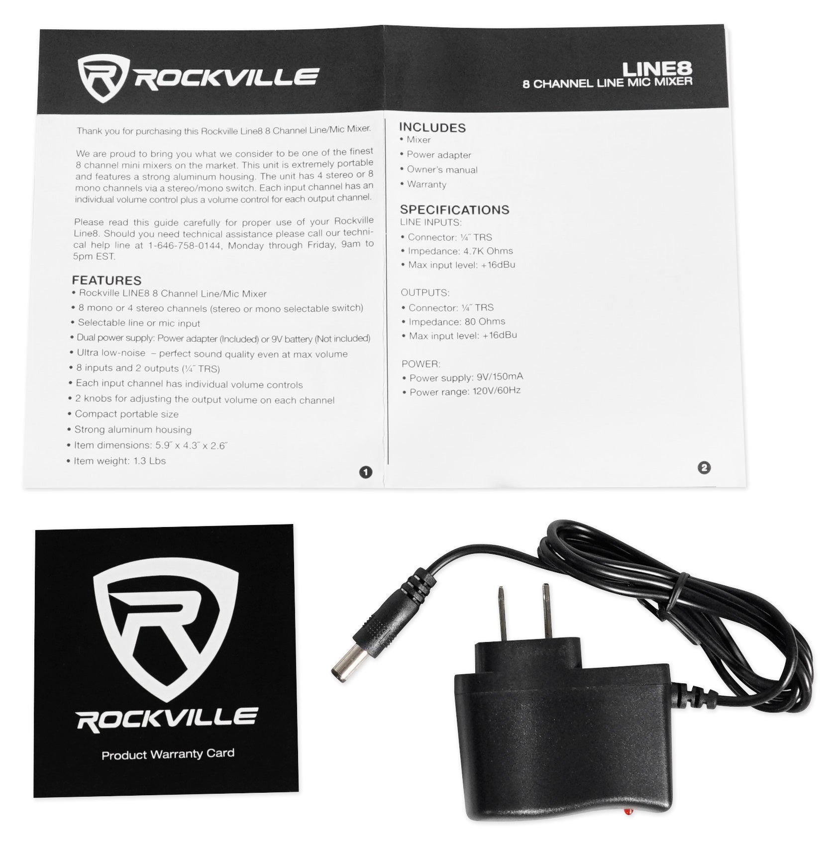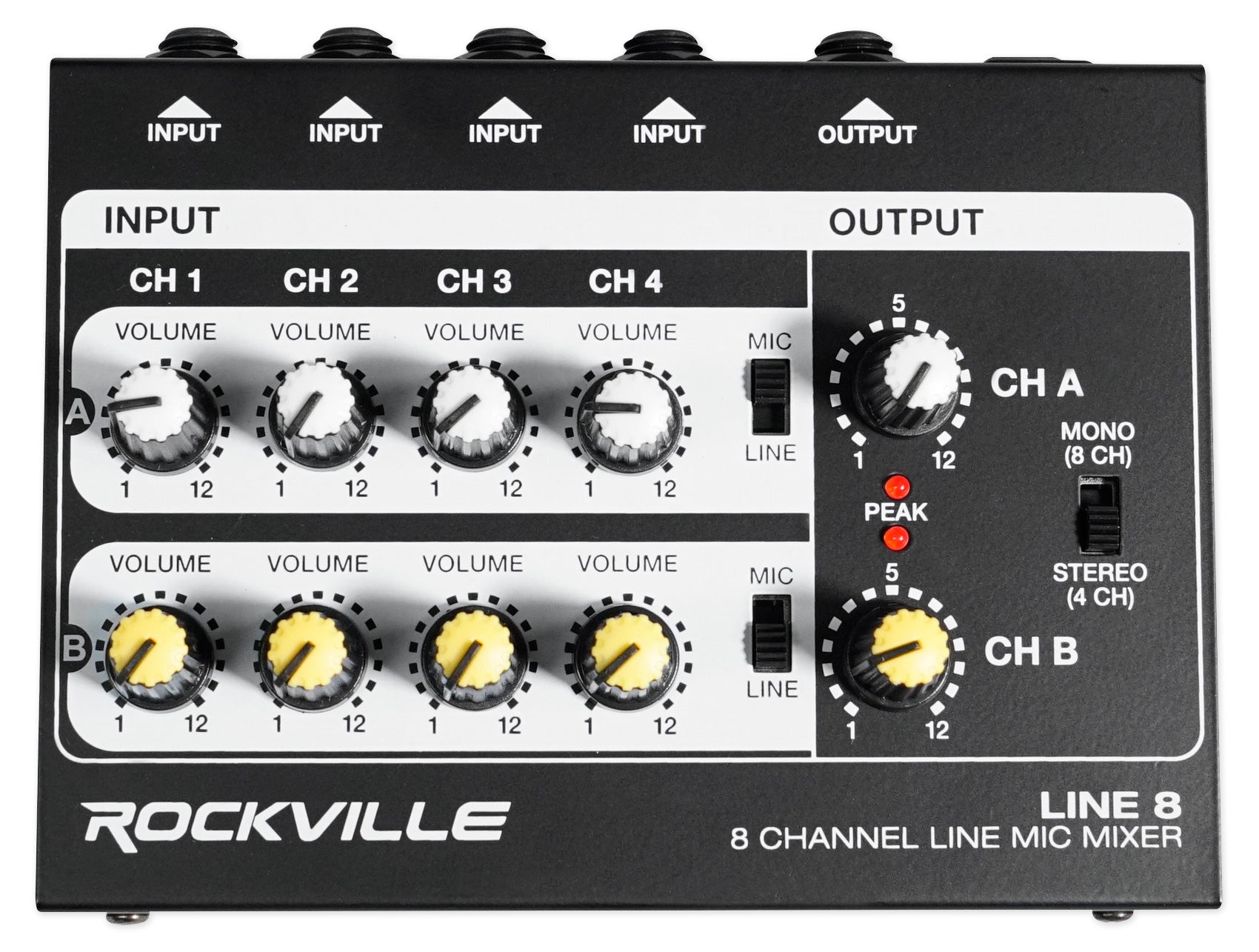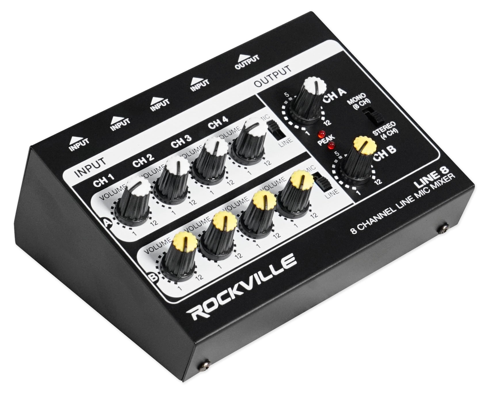 - Rockville LINE8 8-Channel Line and Microphone Stereo/Mono Mixer with Battery Operated or Power Adapter