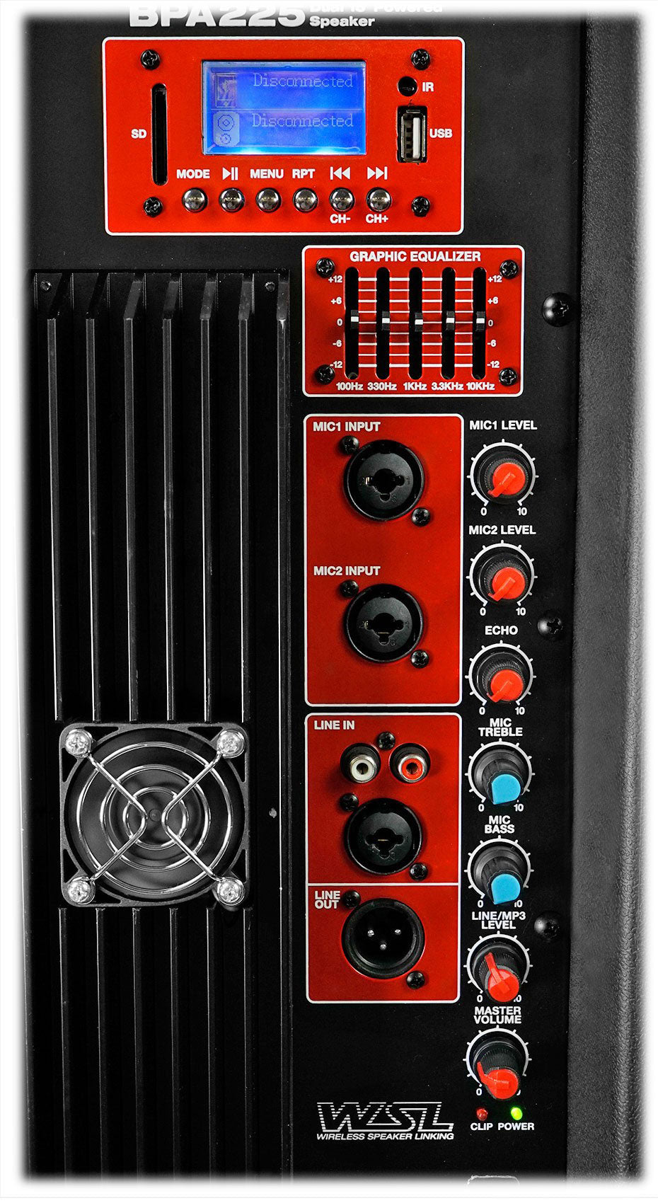 The BPA225 is a complete all-in-one dual 15” powered DJ speaker with incredible bass and clear highs! This speaker is a powerhouse! It goes crazy loud! It is perfect for parties with around 500 people or less. Yes it is truly that loud!