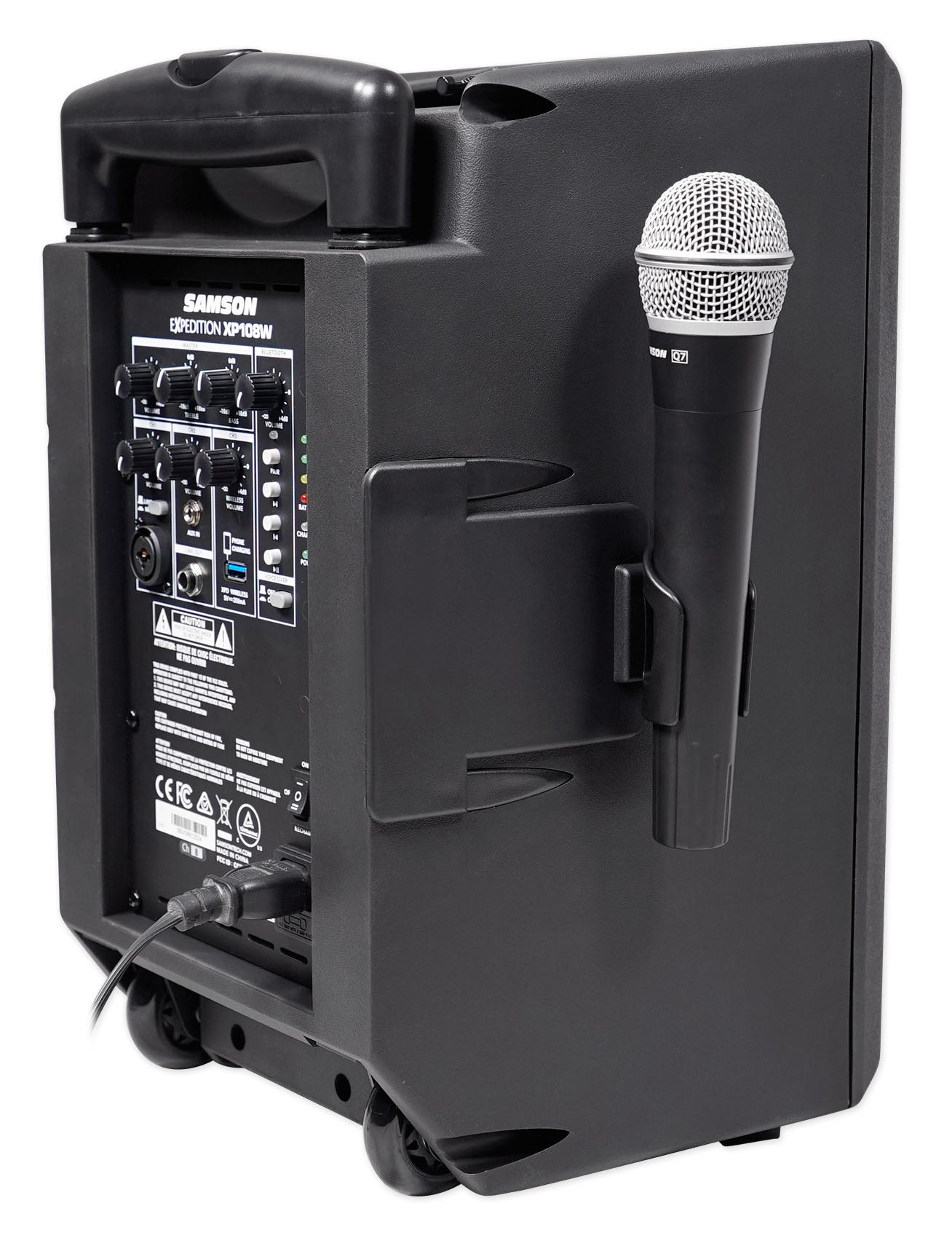 The XP108w features a USB wireless port for use with Samson XPD Series USB Digital Wireless Systems (sold separately), and can also be used for phone charging. The mixer's Voiceover switch enables a ducker circuit that automatically lowers the music while someone is speaking into the included mic or using the USB wireless port. The XP108w also offers a standard 1 3/8" speaker stand mount for optimal placement, as well as a side microphone mounting clip for storing/transporting the included wireless microphone.