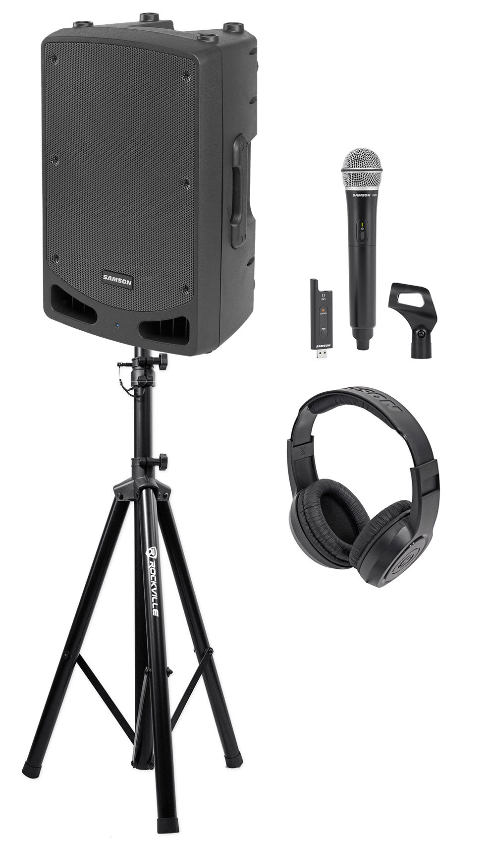 Samson RL112A 12" 800 Watt Powered DJ PA Speaker+Stand+Wireless Mic+Headphones