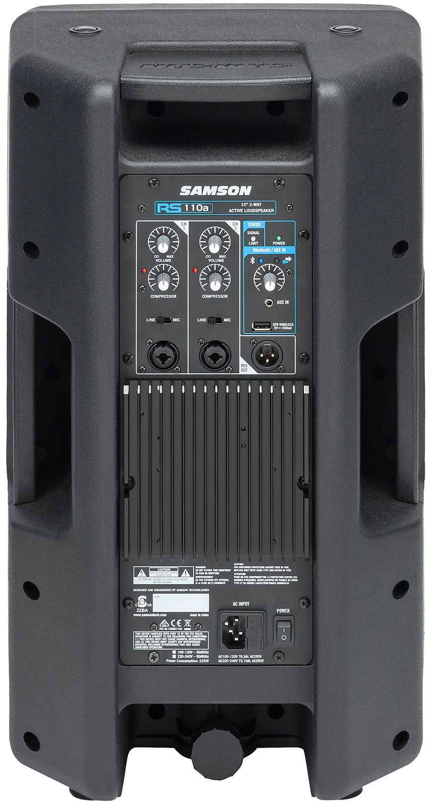 The RS110a features all the essential connections for integration with any sound setup. The onboard mixer is equipped with two selectable Mic/Line XLR-1/4” combo input channels for mics or instruments, each with variable compressor controls. An additional 1/8” line level input offers connections for phones or external music players as well as Bluetooth connectivity. A USB wireless port can be used with Samson XPD series wireless microphone systems (sold separately). It also features a handy XLR Mix Output for connecting the RS110a to additional speakers.