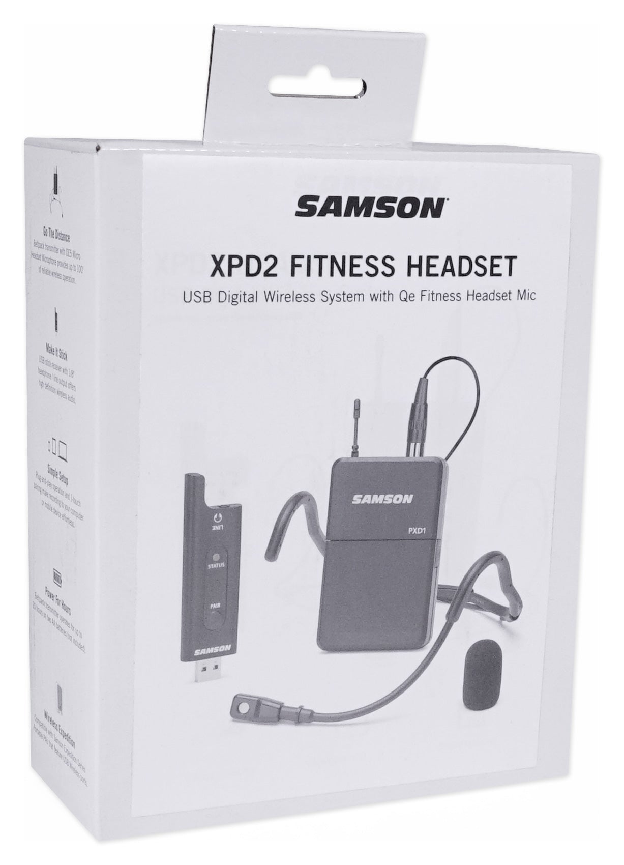 The Samson XPD2BQe USB Wireless System is ideal for fitness/aerobics/spin/yoga instructors and high energy performers that need a rugged, sweat resistant wireless headset. Samson's XPD2BQe Headset USB Digital Wireless System delivers high definition audio for use with Samson's USB equipped portable PA systems, SM4 Mixer, laptops, tablets or smartphones. Unlike traditional wireless systems that require complex setup, the Samson XPD2BQe headset system automatically pairs the receiver to the transmitter. Featuring a USB-powered receiver, AA battery powered belt pack transmitter, and Qe Dual Ear Headset the XPD12BQE provides convenient, 1-touch setup and 100' of reliable wireless operation.