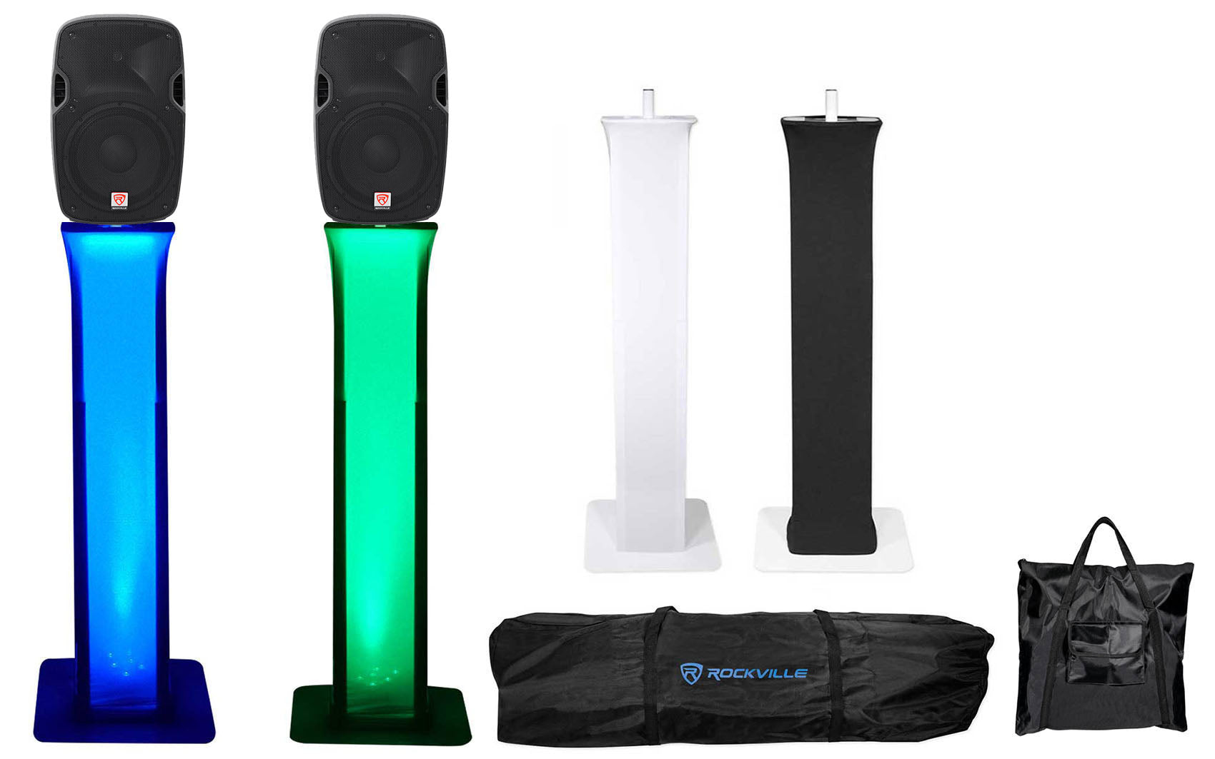 - (2) Rockville RTP32W Totem Moving Head Light Stands+Black+White Scrims+Carry Bags