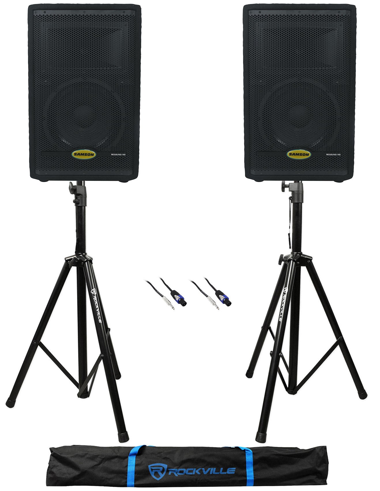 (2) Samson RS10HD 10" 2-Way 300w Wooden Passive PA Speakers+Stands+Cables+Bag